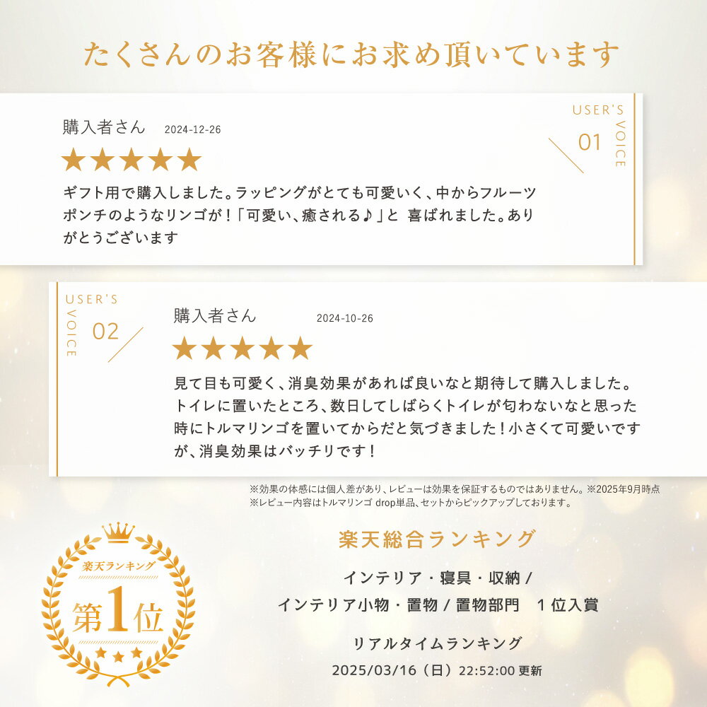 メーカー希望小売価格はメーカーサイトに基づき掲載しています。 【商品情報】 商品名 トルマリンゴ drop [ ドロップ ] 置くだけで心地よさ広がる、お部屋にやさしい空気のアクセント 商品特性 リビングや寝室、玄関やオフィスなど、日常の空間に寄り添うインテリア雑貨です。お好みの場所に置くだけで、暮らしに心地よさやちょっとした癒しをプラスします。 設置場所 玄関、 リビング、 トイレ、 寝室、 デスク周りなど、 空気を整えたい場所に設置してください。 ご利用の目安 6 畳程度の空間に対して、 1~2個の設置をおすすめします。 ※お部屋の広さに応じて複数個の併用をご検討ください。 バリエーション 全10種類 内容量 1個 本体サイズ[重量] W70mm × H62mm × D57mm [ 96g ] 材質 [ 容器 ] プラスチック [ 内容物 ] 水、吸水性ポリマー、鉱石 お買い替え目安 ご使用から約6ヶ月 原産国 日本製 製造販売元 株式会社ハッピートーク ご注意 ・ご使用前に商品説明を必ずご確認ください。 ・商品写真はできる限り実物に近い色味で掲載しておりますが、モニター設定や照明環境により実際と異なる場合があります。 ・使用感や感じ方には個人差があり、効果を保証するものではございません。 検索用キーワード 【季節・イベント】 お正月 御正月 御年賀 お年賀 御年始 初盆 お盆 お彼岸 残暑 クリスマス 春夏秋冬 年末 年明け 春 夏 秋 冬 真夏 真冬 ゴールデンウィーク GW 夏休み 冬休み 年末年始 成人の日 バレンタイン バレンタインデー 桃の節句 ひな祭り ホワイトデー 卒業 卒業祝い 入学 入学祝い 入園 入園祝い 就職 就職祝い 退職 退職祝い 転勤 転勤祝い 新築 新築祝い 引越 引越し祝い 端午の節句 七夕 母の日 母の日ギフト 父の日 父の日プレゼント 敬老の日 敬老会 残暑見舞い 暑中見舞い ハロウィン 七五三 忘年会 新年会 お中元 お歳暮 誕生日 バースデー birthday 記念日 anniversary 記念品 贈答品 プチギフト 内祝い 結婚祝い 出産祝い 還暦祝い 古希祝い 喜寿祝い 米寿祝い 開店祝い お返し【贈る相手】 家族 親戚 両親 義両親 父 お父さん パパ 母 お母さん ママ 義母 義父 妊婦 マタニティ 兄弟 姉妹 子供 子ども こども キッズ 赤ちゃん ベビー 幼児 孫 甥 姪 おばあちゃん おじいちゃん 祖母 祖父 シニア 高齢者 老人 先生 職場 社長 上司 先輩 後輩 同僚 部下 社会人 学生 大学生 高校生 中学生 小学生 幼稚園 保育園 奥さん 旦那さん 主婦 夫婦 友人 友達 女友達 男友達 彼氏 彼女 カップル ともだち 還暦 30代 40代 50代 60代 70代 80代 女性 レディース 男性 メンズ【ギフト・贈り物】 ギフト プレゼント 贈り物 贈答 贈答品 記念品 記念グッズ プチギフト 母の日ギフト 父の日ギフト 敬老の日ギフト クリスマスギフト バレンタインギフト ホワイトデーギフト 誕生日プレゼント バースデープレゼント 結婚祝いギフト 出産祝いギフト 還暦祝いギフト 古希祝いギフト 喜寿祝いギフト 米寿祝いギフト 内祝い お返し 御礼 ご挨拶 引き出物 引っ越し祝い ノベルティ 景品 粗品 gift present birthday gift anniversary gift【使う場所】 オフィス 会社 自宅 家庭 リビング ダイニング 寝室 ベッドルーム 書斎 勉強部屋 キッチン 玄関 トイレ 洗面所 バスルーム 車内 ドライブ 車中泊 旅行 出張 学校 教室 塾 図書館 カフェ ホテル 宿泊施設 在宅勤務 在宅ワーク テレワーク【雑貨ワード】 インテリア雑貨 インテリア小物 オブジェ 置物 飾り ディスプレイ グッズ 空間ケア 癒しグッズ リラックス雑貨 消臭グッズ アロマグッズ 空気清浄グッズ 天然石 パワーストーン トルマリン 雑貨小物 雑貨インテリア【特徴】 日本製 高品質 国内生産 軽量 小型 コンパクト 置くだけ 簡単 おしゃれ デザイン性 シンプル カラーバリエーション 豊富 癒し リラックス リフレッシュ