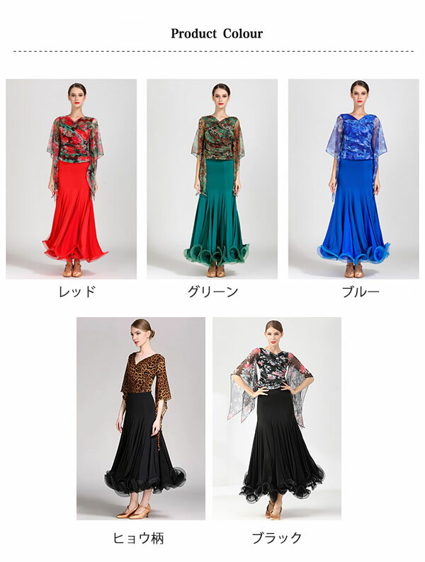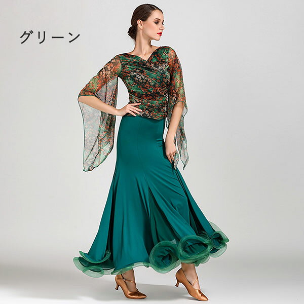 社交ダンス 衣装 ドレス トップス スカート セット モダンダンス スタンダード ワルツ タンゴ レッスン着 演出用 花柄 レオパード柄 ロング丈 透け感 大人 レディース S-3L レッスンウェア モダンドレス 競技着 競技会 演出 スタンダードドレス di280f3f3h2