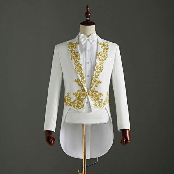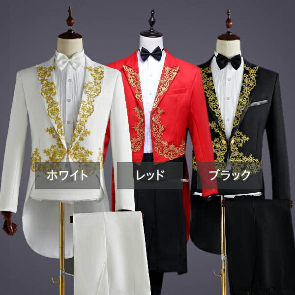 燕尾服 メンズ タキシード ジャケット ズボン セットアップ 刺繍入り ステージ衣装 フロックコート 王子様風 公爵風 演劇 声楽 カラオケ 演奏会 発表会 学園祭 舞台衣装 S~2XL ブラック レッド ホワイト 学芸会 学習発表会 生活発表会 ブラック 赤 ホワイト dg204g4g4x1