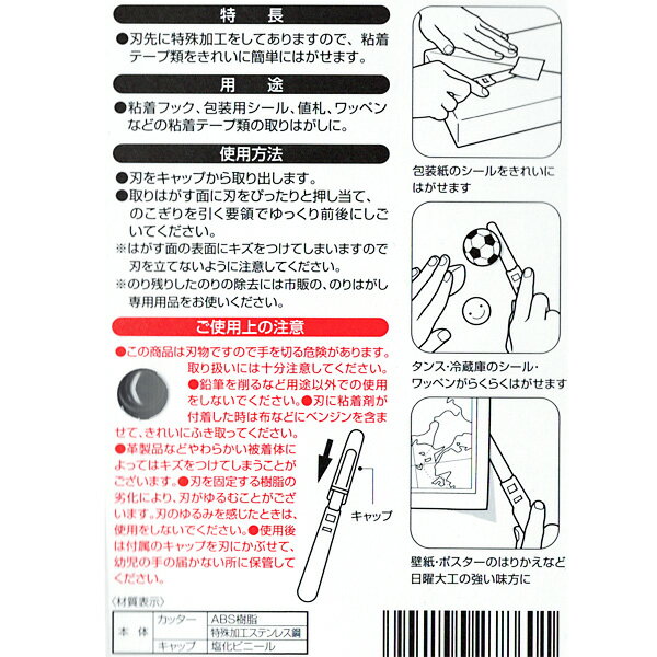 ◆2個まで《メール便》で送れます。 ◆同梱して荷姿が大きくなったときは宅配便(別送料)になります。 ◆3980円以上送料無料対応ショップです。 ■2019年2月よりリニューアルしました(パッケージ、キャップ、商品番号、JANコード変更)カッター本体に変更はありません。 ●シール剥がし、テープ剥がしのヒミツ兵器。 ●五角形に特殊加工された先端部の刃先は、テープをはがすのに最も有効なカタチで、被着体を傷つけることなく簡単にはがせます。 ●粘着フック・粘着テープ・値札・ワッペンなどの各種粘着製品の貼あとを、きれいにはがします。 ●包装用のテープ・シール・タンス・冷蔵庫のシール・ワッペンがきれいにはがせます。 ●レターオープナーとして、3Dプリンターの樹脂剥がしとしてもおすすめ。 ■サイズ:22mm×170mm×20mm ■入数:1個 ■材質:ABS樹脂(グリップ)、特殊加工ステンレス鋼 ■ご使用前には必ず商品の注意事項をお読みください。↓こちらの商品は同一商品に限り2個までメール便配送が可能です。