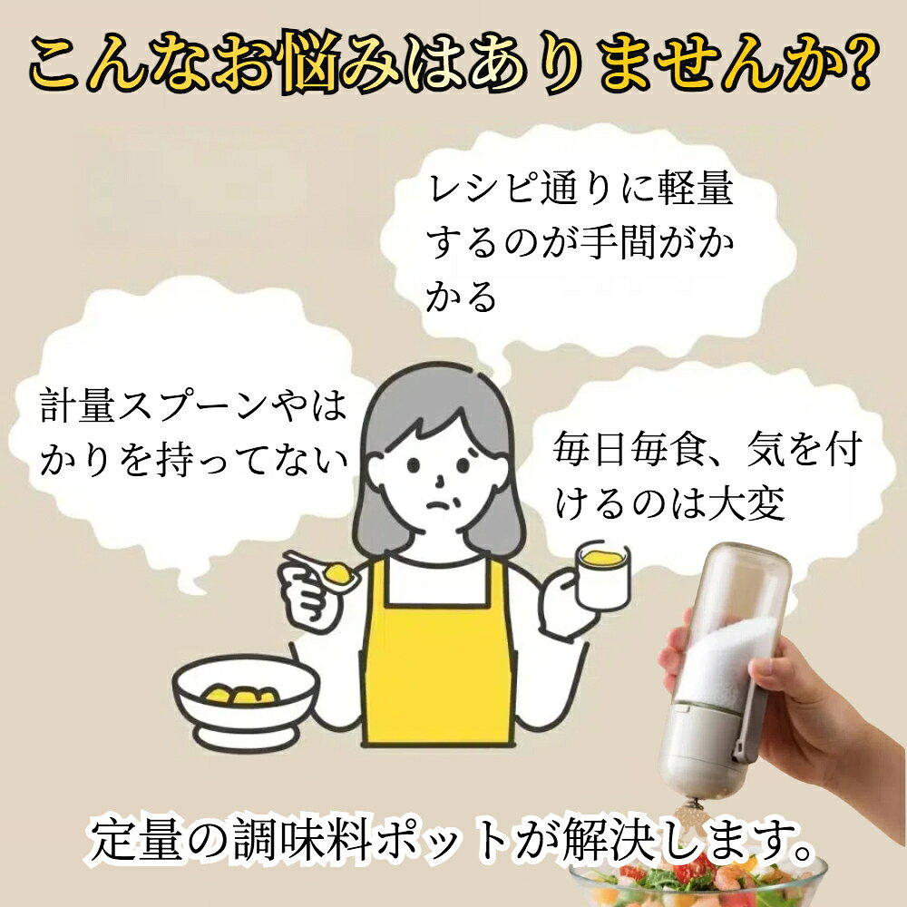 商品詳細商品内容定量調味料ポットx1商品説明【定量調味料ポット】この調味料ポットではグリップを一回押すことで0.5g調味料が出ます。塩分、糖分控えめに役に立ちます。より健康な生活へ過ごしましょう。【斜め蓋設計】斜め蓋設計により調味料を平均的撒き散らします、水蒸気が入りにくく、調味料の塊りを避ける事が可能。新しい環境に合わせて、暮らしをもっと快適に。【片手操作の便利さ】片手で操作可能なデザインが特徴で、料理中に他の作業をしながらでも簡単に調味料を加えることができます。これにより、キッチンでの作業効率が向上します。【透き通ったガラス&洗いやすい】コンパクトで可愛いガラスの透明度が高くて、容器の外から見るとどんな調味料が入っているのかがわかります。洗いやすくてお湯で消毒するもでき、いつでも清潔に保ちます。【幅広い調味料に対応可能】塩、コショウ、スパイス、砂糖など様々な調味料に対応しており、その使用は非常に広範囲です。シンプルかつモダンなデザインは、どんなキッチンのインテリアにもよく合い、見た目も美しいです。製品仕様パッケージ内容:定量調味料ポットx1製品仕様:重さ:242g容量:250mlサイズ:約8.5x6x16.5mmボトル:ガラスバネ:ステンレス304ピストン、ハンドル:ABS蓋:PP注意事項【注意事項】1、グリップを一回押すことで必ず0.5gではなくて、調味料の種類によって差があります。(使用前に一度秤で確認してください。2、紹介画像はイメージです。実際の商品とはデザイン、仕様が一部異なる場合がございます。3、商品のパッケージ、デザイン、仕様、外観は改良のため、予告なく変更する場合がありますのでご了承ください。4、モニターの環境等により、色の見え方に若干差が生じる場合がございます。5、環境保護のため、配送途中の衝撃等から守るのに最低限必要と判断した簡易梱包(箱無し)にてお送る事がございます。予めご了承ください。6、寸法は手測りなので若干の誤差(1cm~3cm )がある場合がございますので、予めご了承ください。7、同じ商品でも生産時期により形やサイズ、カラーに多少の誤差が生じる場合もございます。安心保証安心保証付き♪30日間!!品質保証、返品交換OK。・到着日から30日間対応致します。・在庫がある商品に限ります。・袋やタグが無くても対応致します。・イメージ違いによる返品も可。・出荷時・返送時送料はお客様負担となります。キーワード定量調味料ポット 調味料入れ 塩入れ容器 調味料入れ おしゃれ 調味料缶 調味料ケース 調味料ボトル 薬味入れ スパイスボトル 七味入れ 塩 コショウ 砂糖入れ 薬味入れ 調味料ポット キッチン 台所 塩入れ 卓上 七味入れ キッチン用品 プレゼントこの商品を見ている人はこちらもチェック【定量調味料ポット】この調味料ポットではグリップを一回押すことで0.5g調味料が出ます。塩分、糖分控えめに役に立ちます。より健康な生活へ過ごしましょう。【斜め蓋設計】斜め蓋設計により調味料を平均的撒き散らします、水蒸気が入りにくく、調味料の塊りを避ける事が可能。新しい環境に合わせて、暮らしをもっと快適に。【片手操作の便利さ】片手で操作可能なデザインが特徴で、料理中に他の作業をしながらでも簡単に調味料を加えることができます。これにより、キッチンでの作業効率が向上します。【透き通ったガラス&洗いやすい】コンパクトで可愛いガラスの透明度が高くて、容器の外から見るとどんな調味料が入っているのかがわかります。洗いやすくてお湯で消毒するもでき、いつでも清潔に保ちます。【幅広い調味料に対応可能】塩、コショウ、スパイス、砂糖など様々な調味料に対応しており、その使用は非常に広範囲です。シンプルかつモダンなデザインは、どんなキッチンのインテリアにもよく合い、見た目も美しいです。商品詳細商品内容定量調味料ポットx1商品説明【定量調味料ポット】この調味料ポットではグリップを一回押すことで0.5g調味料が出ます。塩分、糖分控えめに役に立ちます。より健康な生活へ過ごしましょう。【斜め蓋設計】斜め蓋設計により調味料を平均的撒き散らします、水蒸気が入りにくく、調味料の塊りを避ける事が可能。新しい環境に合わせて、暮らしをもっと快適に。【片手操作の便利さ】片手で操作可能なデザインが特徴で、料理中に他の作業をしながらでも簡単に調味料を加えることができます。これにより、キッチンでの作業効率が向上します。【透き通ったガラス&洗いやすい】コンパクトで可愛いガラスの透明度が高くて、容器の外から見るとどんな調味料が入っているのかがわかります。洗いやすくてお湯で消毒するもでき、いつでも清潔に保ちます。【幅広い調味料に対応可能】塩、コショウ、スパイス、砂糖など様々な調味料に対応しており、その使用は非常に広範囲です。シンプルかつモダンなデザインは、どんなキッチンのインテリアにもよく合い、見た目も美しいです。製品仕様パッケ
