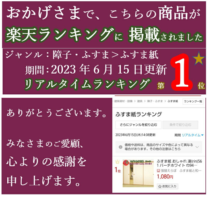 商品情報サイズ・生地寸法 巾(はば)94cm × 長さ1m単位以上での切り売り材質パルプ色バーチホワイト 板目 (白・ホワイト系 木目調柄)商品説明襖紙「ルノン 凜」は、モダンなふすま紙デザインで和室・洋間を問わずご利用いただけます。2012年度グッドデザイン賞受賞。必要な長さを切り売り(つながったロール状)にて出荷いたしますので、背が高い(長い)襖にも対応可能です。モダンなデザインで和室界隈を盛り上げます。白(ホワイト)系の木目調のモダンふすま紙。和室・洋間が様変わりします。テレワーク時の背景にも。ふすま紙の裏面は、茶色(黄色)の紙で裏打ちしてあるため、裏透けしにくく、紙に厚みがあります。このふすま紙(襖紙)はプロの職人さんも使用する品質のふすま紙で、アイロンやシール、両面テープなどを使用せずに、別途ふすま用でんぷん糊を用意して貼るタイプのふすま紙です。「糊で張る(貼る)ふすま紙」と聞くと、一見難しそうに感じるかもしれませんが、糊張り襖紙には・ふすま紙の裏面全面を濡らすため、紙が乾く際に縮む力を利用して、ふすまをきれいに張りやすい・糊が乾くまでなら張り直し(位置の決めなおし)が比較的容易・適度な濃さで張られた糊張りふすま紙は、はがす際に跡が残りにくく、ふすま(下地)を痛めにくいといったメリットがあり、おすすめのふすま(襖)の張り方(貼り方)です。【おかげさまでこちらの商品が、楽天市場『ふすま紙』ジャンル、2023年6月15日更新のリアルタイムランキングにおいて、ランキング第1位に掲載されました。】【掲載ランキング】リアルタイムランキング【更新日】2023年6月15日14:08【ランキング順位】第1位【ジャンル】花・ガーデン・DIY>木材・建築資材・設備>建具>障子・ふすま>ふすま紙皆様のご愛顧、心よりの感謝を申し上げます。なおランキング掲載画像に記載されている商品価格は、ランキング掲載当時の価格です。当時と商品価格が異なる場合がございますので、詳しくは最新の商品ページにてご確認ください。ご注文いただいた長さを、ロール状につながった状態で出荷いたしますので、背の高い襖にも、高さの制限なくお使いいただけます。凜(rin)561柄:木目調 (バーチ ホワイト 板目)・生地寸法 有効巾(はば)94cm × ご注文いただいた長さ※こちらの商品は、ご注文いただいた長さがすべてつながった1本のロール状にてご用意、発送いたします。(1メートルあたりの販売価格が記載の商品価格となります)ご注文数が『1』なら1メートル、『10』なら10メートルがすべてつながったロール状にカットしてお届けいたします。また、1度のご注文内の同一の品番ふすま紙は、ご注文数を合計したうえで、すべてがつながった1本のロール状でご用意いたします。なお、「合計□メートルの注文を、△メートルごとにカットして欲しい」といったご要望にはお応えできませんので、予めご了承くださいませ。シックハウス対策登録見本帳F ☆☆☆☆※掲載画像はイメージです。画像の特性上、実際の商品とは色味等若干の差異がある場合がございます。ご了承ください。※このふすま紙に糊はついておりません。別途ふすま・障子用でんぷん糊をご用意ください。ふすま紙 おしゃれ 凜(rin)561 バーチホワイト 巾94cm×長さ1メートル単位 切り売り ふすま紙 洋風 モダン おしゃれ 木目 板目 総柄 襖紙 洋間 白 ホワイト カラー ロール 張替え リメイク デザイン 洋風ふすま紙 ふすま紙洋間 diy 襖紙diy リフォーム 長い 背が高い 日本の家屋に良く合う和室・洋室を選ばない木目調のふすま紙モダンな総柄です。つながったロール状のふすま紙ですので、2mを超えるような背が高いふすまにも使用できます。 襖紙「ルノン 凜」は、モダンなふすま紙デザインで和室・洋間を問わずご利用いただけます。2012年度グッドデザイン賞受賞。必要な長さを切り売り(つながったロール状)にて出荷いたしますので、背が高い(長い)襖にも対応可能です。モダンなデザインで和室界隈を盛り上げます。白(ホワイト)系の木目調のモダンふすま紙。和室・洋間が様変わりします。テレワーク時の背景にも。ふすま紙の裏面は、茶色(黄色)の紙で裏打ちしてあるため、裏透けしにくく、紙に厚みがあります。このふすま紙(襖紙)はプロの職人さんも使用する品質のふすま紙で、アイロンやシール、両面テープなどを使用せずに、別途ふすま用でんぷん糊を用意して貼るタイプのふすま紙です。「糊で張る(貼る)ふすま紙」と聞くと、一見難しそうに感じるかもしれませんが、糊張り襖紙には・ふすま紙の裏面全面を濡らすため、紙が乾く際に縮む力を利用して、ふすまをきれいに張りやすい・糊が乾くまでなら張り直し(位置の決めなおし)が比較的容易・適度な濃さで張られた糊張りふすま紙は、はがす際に跡が残りにくく、ふすま(下地)を痛めにくいといったメリットがあり、おすすめのふすま(襖)の張り方(貼り方)です。【おかげさまでこちらの商品が、楽天市場『ふすま紙』ジャンル、2023