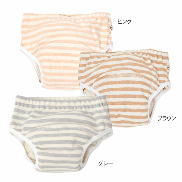 商品番号 / 型番:36-143 / P10430ブランド名:ORGANIC GARDEN商品名:オーガニックコットン トイレトレーニングパンツ ボーダーオーガニックコットンのギフトや出産祝いにご利用くださいオーガニックコットン トイレトレーニングパンツ ボーダー オーガニックコットンでパンツの気持ちよさを ORGANIC GARDENのオーガニックコットン トイレトレーニングパンツ ボーダーです。 ボーダー柄の部分はオーガニックコットン100%のやわらかいスムース生地。 肌にあたる内側(吸収部分)は厚手パイル生地で、間に防水布(ポリエステル)をはさんだ3重構造です。 防水布が挟まれているので、ちょっとのおしっこは吸収してくれます。 適度な不快感でおもらしが自覚できるので、おむつ外しがスムーズに進みそう◎ ウエストは少し太めのゴム。 ※ウエストゴム替え不可 足回りは防水テープでパイピング(縁取り)しているので、横漏れしづらくなっています。 パンツの気持ちよさを知ってもらうトイレトレーニング。 オーガニックコットンのとても柔らかな、本当に気持ちの良いパンツを選んであげたいですね! トイレトレーニングはお子さまの成長の一歩です。 オーガニックコットンでパンツデビューしましょう♪ - Color - ピンク・ブラウン・グレーの3色で、男の子にも女の子にも使いやすいボーダー柄。 【ピンク】【グレー】彩土(ハニ)染めと呼ばれる染色をしています。 古代の染色技術を生かした赤や黄の鮮やかな天然土を精製し、媒染剤などを一切使わず繊維組織に定着させた、人にも地球にもやさしい自然派染色です。 【ブラウン】染色をしていない、オーガニックコットンのカラードコットンを使用した優しいお色味です。 サイズ 90(2-3歳 体重13kg):ウエスト46cm 脇丈9cm ※( )内は適応サイズ ※衣料品の特性上、個体差がある旨ご了承ください。素材 オーガニックコットン100%・スムース 中:防水布 ポリエステル100% 足口防水テープ:ポリエステル100%カラー ピンク×生成(ボーダー) ブラウン×生成(ボーダー) グレー×生成(ボーダー)原産国 日本(奈良県) 製品について ●漂白・染色をしていない生成りの製品は、生地に黒や茶色のポツポツが見えることがあります。 これは製造工程で取りきれなかった綿カス(綿花の葉や茎)で、害はなく洗濯するごとに減少します。 ●自然の色味を生かした製品は、色ムラが生じていたり、日光やお洗濯で色性が変化することがあります。 ●生産ロットにより、同色でも色味の違いや、綿実油による特有のにおいが生じることがございます。 ●漂白・染色・プリントを行っている生地につきましては、オーガニックコットン認証基準に基づいて製造され、化学薬品の使用を極力抑えたものとなっております。 ●洗濯は洗濯ネットを使用して優しくお洗濯してください。 ●蛍光剤入りの洗剤や漂白剤、乾燥機のご使用はお避けください。 ●アイテム毎の注意事項につきましては、製品に付いているタグ等をご確認ください。 ●タグ等の材質に硬いものが含まれている場合、使用前にご確認の上、不要な物は取り除いてください。 ●プラスティックごみの排出を抑えるため、パッケージは再利用をしていることがございます。