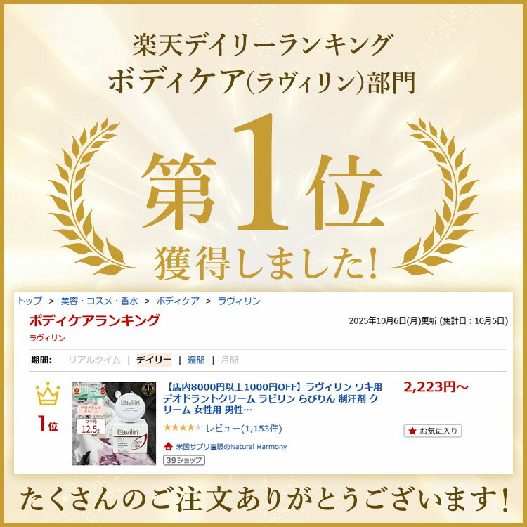 商品説明 ●カモミールやアルニカ、キンセンカなど、天然ハーブエキス配合でお肌に優しい上に、脇のニオイの原因となるバクテリアにアプローチし、ケアします ●アルコール、アルミニウム、パラベンはいずれも含まないので、敏感肌の方も◎ ●汗をかいてもお風呂やプールに入っても、一度で効果は長持ち♪ ●うっかり忘れた朝も、いきなりのミーティングでも心配いりません!お手入れも簡単でしかも経済的です【Lavilinのこだわり】 アルミニウム塩不使用 / パラベンフリー / アルコールフリー / フタル酸エステル不使用 / BHTフリー / ワセリンフリー / クルエルティフリー (動物実験なし) / CTFA認定 / ISO認証 (ISO 9001:2000 規格) 足用はこちら 消費期限・使用期限の確認はこちら 内容量 12.5g 成分内容 キャスター種子オイル&水素化キャスターオイル&ブラジルロウヤシワックス、タルク、酸化亜鉛、ジャガイモでんぷん質、ラクトース、牛乳プロテイン、ビフィズス菌発酵液、エチルヘキシルグリセリン、クエン酸トリエチル、マトリカリアエキス、大豆オイル、キンセンカ花エキス、アルニカ・モンタナ花エキス、トコフェロール、香料、O-シメン-5-オール ※詳しくはメーカーサイトをご覧ください。 使用方法 ・最初のご利用の前、48時間は他のデオドラント製品のご利用を控えてください。 ・わきの下をきれいに洗い、乾燥させてください。 ・指先に少量を取り、わきの下の中心からやさしく伸ばしてください。 ・その後は必要に応じてご利用ください。ただし連日のご使用を意図した製品ではございません。 メーカー Hlavin Industries (ハラヴィンインダストリーズ) ・開封後は12ヶ月以内にご使用ください。 ・シェービング後や傷のある箇所には使用しないでください。 ・お届け時のシーリングの状態につきまして、シーリングの強度が弱い場合や、輸送中の気圧の影響等により剥がれた状態でお届けとなっている状況が確認されております。また、クリーム自体がやわらかいため、輸送中の環境によってはクリーム自体が偏った状態になる事もございます。そのため、上記のような状態でも意図的に開封等がされたわけではなく、上記の影響によることが当店にて確認されておりますので、ご安心してご使用ください。 ・お肌に合わない場合は使用をやめ、症状によっては医師にご相談ください。 ・効能・効果の表記は薬機法により規制されています。 ・医薬品該当成分は一切含まれておりません。 ・メーカーによりデザイン、成分内容等に変更がある場合がございます。 ・製品ご購入前、ご使用前に必ずこちらの注意事項をご確認ください。 Lavilin Underarm Deodorant Cream 生産国: イスラエル 区分: 化粧品 広告文責: ㈱ REAL MADE 050-3138-5220 配送元: CMG Premium Foods, Inc. デオドラント でおどらんと 匂い 臭い におい ニオイ エチケット マナー 運動 運動後 フィットネス ワークアウト トレーニング ジム 筋トレ スポーツ 汗 消臭 脇 ワキ わき 海外 外国 人気 定番 おすすめ オススメ 男性 女性 スプレー スティック あんだーあーむ 脇 ワキ わき 女性用 男性用 デオドラント でおどらんと 化学薬品不使用 ラヴィリン ラビリン らびりん lavilin