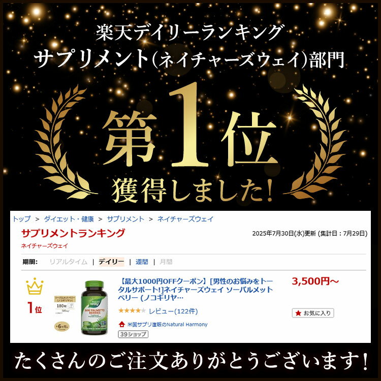 商品説明 ●ノコギリヤシとして知られるメンズハーブ! ●果実由来成分を585mg配合! ソーパルメットは、中高年男性の健康をサポートするハーブとして、すっかり定着しており、別名ノコギリヤシなどとも呼ばれています。 ネイチャーズウェイ社のソーパルメットは、果実由来成分を585mg配合!パワフルに健康をサポートします。【Nature's Wayのこだわり】 GMP (適正製造基準) 認証 / CRN団体のリーダー 粒数違いはこちら 消費期限・使用期限の確認はこちら 内容量 / 形状 180カプセル 成分内容 【1粒中】 ソーパルメット(果実)585mg 他成分: ゼラチン(カプセル)、ステアリン酸マグネシウム、シリカ ※製造工程などでアレルギー物質が混入してしまうことがあります。※詳しくはメーカーサイトをご覧ください。 飲み方 食品として1日1〜3粒を目安にお水などでお召し上がりください。 メーカー Nature's Way (ネイチャーズウェイ) ・妊娠中の方、授乳中の方は事前に医師とご相談の上お使いください。 ・効能・効果の表記は薬機法により規制されています。 ・医薬品該当成分は一切含まれておりません。 ・メーカーによりデザイン、成分内容等に変更がある場合がございます。 ・製品ご購入前、ご使用前に必ずこちらの注意事項をご確認ください。 Saw Palmetto Berries 180caps 生産国: アメリカ 区分: 食品 広告文責: ㈱ REAL MADE 050-3138-5220 配送元: CMG Premium Foods, Inc. 人気 にんき おすすめ お勧め オススメ ランキング上位 らんきんぐ 海外 かいがい さぷりめんと 健康 けんこう へるしー ヘルシー ヘルス ヘルスケア へるすけあ 手軽 てがる 簡単 かんたん supplement health ねいちゃーずうぇい そーぱるめっと のこぎりやし ▼ サプリ便利アイテム ▼▼ 半数以上の人が一緒に買っているサプリはコチラ ▼