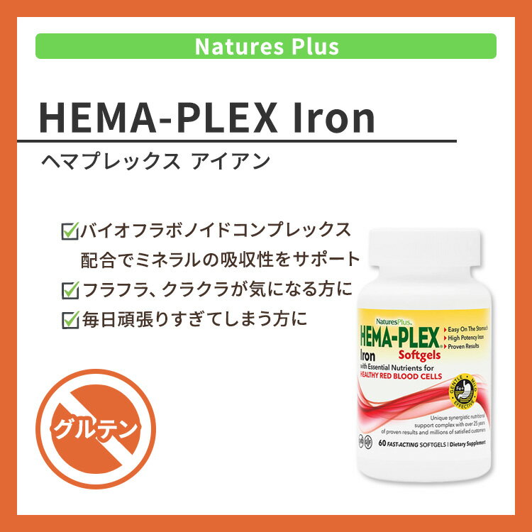 【当店過去最大級MAX2540円OFFクーポン】[健康を維持したい方に]ネイチャーズプラス ヘマプレックス アイアン ソフトジェル 60粒 NaturesPlus HEMA-PLEX Iron Softgels 鉄 鉄分 バイオフラボノイドコンプレックス