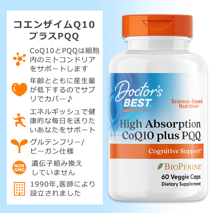 【店内8千円以上1000円OFFクーポン】[エイジングケアの定番!]ドクターズベスト コエンザイムQ10 100mg プラス PQQ 20mg 60粒 ベジカプセル Doctor's Best CoQ10 plus PQQ サプリメント ユビキノン ピロロキノリンキノン 高吸収 いきいき 若々しさ ハイアブソープション
