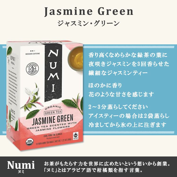 【店内8千円以上1000円OFFクーポン】[ホッと一息タイムに]ヌミ ジャスミングリーンティー 18包 36g (1.27oz) Numi Jasmine Green Tea Caffeinated オーガニック ティーバッグ 緑茶 花の香り 茉莉花茶 華やかな香り【お取り寄せ商品】【合わせて買いたい】