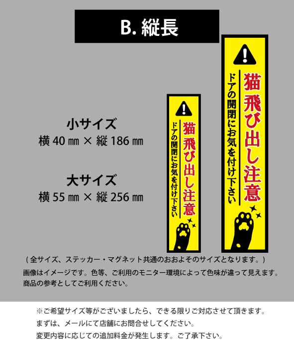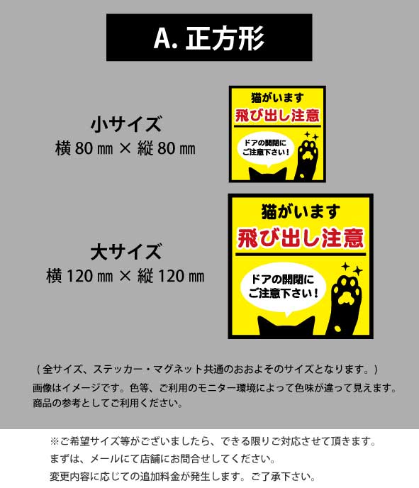 ステッカー/マグネット サイズ (正方形・小サイズ)80mm×80mm (正方形・大サイズ)120mm×120mm (縦長・小サイズ)40mm×186mm (縦長・大サイズ)55mm×256mm 商品説明 ステッカー(インクジェットタイプ) ・屋外長期用看板用インクジェットステッカー(強粘着糊塩ビシート ) UV・防水ラミネート加工済み 空気が抜けやすいエアーレスステッカー 屋外耐候:3~5年(使用環境により異なる)※強い日差しを常に浴びる悪環境下ではその限りではございません。 ※水貼りはしないで下さい! マグネット ・車両用マグネットシート(国産/厚さ8ミリ/ 異方性) 【使用上のご注意】 ・貼付けに、マグネットが張り付けれるかの事前の確認をお願いします。貼付け面が、平滑な面である事を確認して下さい。凹凸面へは貼付けしないで下さい。 ・長時間の貼付けはお控え下さい。一日に一度取り外し、本製品と相手側の汚れや水分を拭き取り、再度ご使用下さい。 ・高温(80℃以上)多湿になる環境での使用は、お控え下さい。 屋外での使用や高温下での使用の際、ブロッキング(被着体への貼りつき)や塗装面の汚染やサビが発生する場合がございます。 ・お車でご使用の際、使用後の毎回取り外して頂き、車ボディの水分・汚れを拭き取り、乾燥させてから改めてご使用下さい。マグネット面にも水分・汚れがある場合は、拭き取り、乾燥後、ご使用下さい。(濡らした柔らかいタオルなどでふき取って下さい。アルコールでの拭き取りはしないで下さい。) 雨水や海水が付着している車体には絶対に貼付けしないで下さい。 マグネットシートと塗装面の間に水分が付着し密閉された状態が続くと、水分を吸収し白濁現象を起こす場合がございます。塗装面に少しでも異変が感じられた場合、ご使用を中止して下さい。 ・洗車時は必ず本製品を取り外して下さい。 ・再塗装車や塗装が劣化している車へのご使用は避けて下さい。 ・高速道路走行の際は、事前に車ボディから本製品を取り外して下さい。 ・本製品をペースメーカー、磁気カード、磁気テープ、時計等、磁気に影響される物へ近づけないで下さい。 マグネットが張り付かなかった等のお客様の事情による返品・交換はできません。トラブルや法令に関する責任(塗装焼け、塗装剥がれ、日焼け、色あせ、その他トラブル)が起きた場合でも、当社では一切の責任を負いません。予めご了承くださいませ。> インクジェットステッカー・シール・転写式・耐候・防水・UV・メール便対応・送料無料・ワンポイント・かわいいペット・猫飛び出し注意・注意表示・開閉注意・脱走注意・ポスト・玄関ドア・ポーチ・エクステリア・門柱・窓サッシ