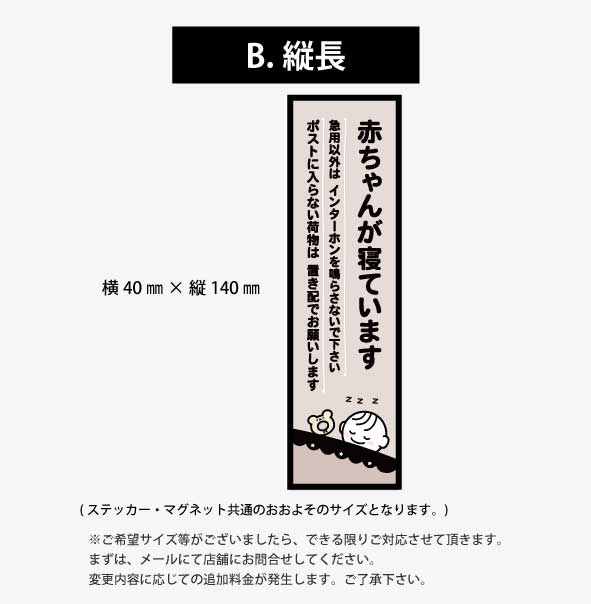 ステッカー/マグネット サイズ (横長)140mm×40mm (縦長)40mm×140mm 商品説明 ステッカー(インクジェットタイプ) ・屋外長期用看板用インクジェットステッカー(強粘着糊塩ビシート ) UV・防水ラミネート加工済み 空気が抜けやすいエアーレスステッカー 屋外耐候:3~5年(使用環境により異なる)※強い日差しを常に浴びる悪環境下ではその限りではございません。 ※水貼りはしないで下さい! マグネット ・車両用マグネットシート(国産/厚さ8ミリ/ 異方性) 【使用上のご注意】 ・貼付けに、マグネットが張り付けれるかの事前の確認をお願いします。貼付け面が、平滑な面である事を確認して下さい。凹凸面へは貼付けしないで下さい。 ・長時間の貼付けはお控え下さい。一日に一度取り外し、本製品と相手側の汚れや水分を拭き取り、再度ご使用下さい。 ・高温(80℃以上)多湿になる環境での使用は、お控え下さい。 屋外での使用や高温下での使用の際、ブロッキング(被着体への貼りつき)や塗装面の汚染やサビが発生する場合がございます。 ・お車でご使用の際、使用後の毎回取り外して頂き、車ボディの水分・汚れを拭き取り、乾燥させてから改めてご使用下さい。マグネット面にも水分・汚れがある場合は、拭き取り、乾燥後、ご使用下さい。(濡らした柔らかいタオルなどでふき取って下さい。アルコールでの拭き取りはしないで下さい。) 雨水や海水が付着している車体には絶対に貼付けしないで下さい。 マグネットシートと塗装面の間に水分が付着し密閉された状態が続くと、水分を吸収し白濁現象を起こす場合がございます。塗装面に少しでも異変が感じられた場合、ご使用を中止して下さい。 ・洗車時は必ず本製品を取り外して下さい。 ・再塗装車や塗装が劣化している車へのご使用は避けて下さい。 ・高速道路走行の際は、事前に車ボディから本製品を取り外して下さい。 ・本製品をペースメーカー、磁気カード、磁気テープ、時計等、磁気に影響される物へ近づけないで下さい。 マグネットが張り付かなかった等のお客様の事情による返品・交換はできません。トラブルや法令に関する責任(塗装焼け、塗装剥がれ、日焼け、色あせ、その他トラブル)が起きた場合でも、当社では一切の責任を負いません。予めご了承くださいませ。> インクジェットステッカー・シール・転写式・耐候・防水・UV・メール便対応・送料無料・ワンポイントポスト・玄関ドア・ポーチ・エクステリア・門柱・窓セキュリティ・犯罪抑止効果・ベビー・赤ちゃん・お昼寝・置き配表示