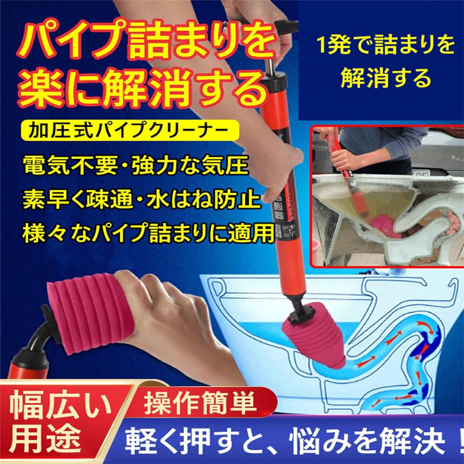 加圧式パイプクリーナー 強力な気圧 使用簡単 水が飛び跳ねにくい 幅広い用途 詰まりを解消する 耐久性 トイレの詰まりを取る道具 多機能パイプクリーナー 様々なパイプ詰まりに適用