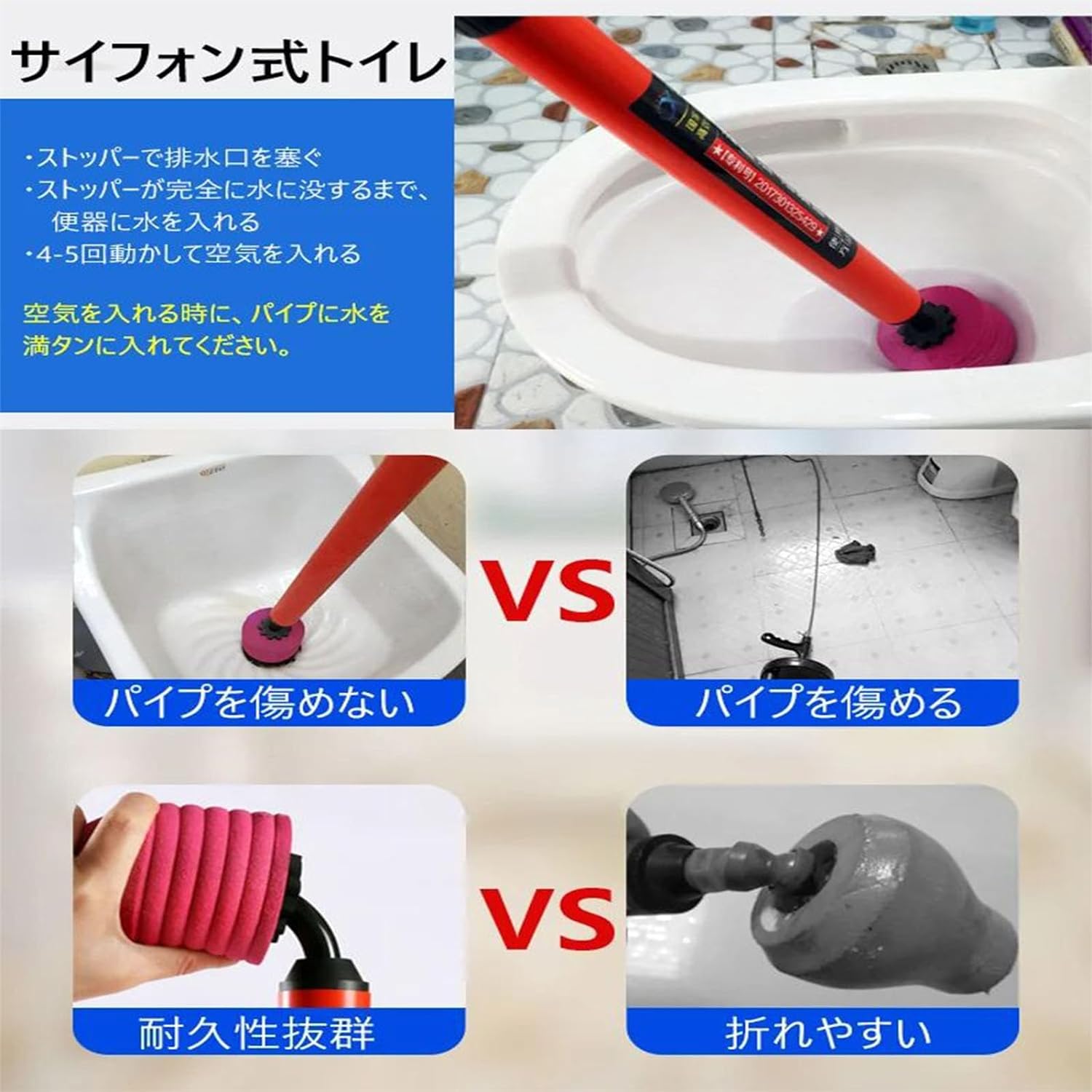 【商品コード】:y813063 【カラー】 レッド 品名:加圧式パイプクリーナー 材質:ステンレス、スポンジ パッケージ内容:1個 * 加圧式パイプクリーナー 用途:便器や排水管の詰まりを解消する。 原産国 : 中国 【この商品について】 高品質な素材を採用され、耐磨耗性、手触りが優れ、丈夫で変形しにくくて長持ち、狭くても楽に対応でき、各種類の便器に適用できます。 高反発のデザインで、密封性や耐磨耗性が良くて、排水管の汚れ・詰まりを予防・解消、あらゆる排水管に使用可能! 使用方法:1:ストッパーを便器の排水口に押し詰める。2:ストッパーが完全に水に没するまで入れる。3:ストッパーでしっかりと排水口を塞ぐ。4:素早く5回空気を入れる。5:ストッパーを抜き出して、水で排水口を流す。6:上記の操作を1-5回繰り返せばいい。 幅広い用途:トイレ、お風呂、台所、パイプなど、突然の詰まりや残った詰まりを解消するために使用でき、家庭や業者の方にもおすすめです。 ご注意: 空気が瞬間的に出るためご使用には十分にご注意ください。子供が届かないところで保管して、他人に向けたり、違う用途でのご使用はおやめください。 ※簡易包装となりますのでご理解の程よろしくお願いします。 ※手動測定による1~3cmの測定偏差を許容してください。 ※モニターや光の効果が異なるため、実際の色は写真の色と若干異なる場合があります。 ※仕様・デザインは改良のため予告なく変更することがあります。【商品コード】:y813063 【カラー】 レッド 品名:加圧式パイプクリーナー 材質:ステンレス、スポンジ パッケージ内容:1個 * 加圧式パイプクリーナー 用途:便器や排水管の詰まりを解消する。 原産国 : 中国 【この商品について】 高品質な素材を採用され、耐磨耗性、手触りが優れ、丈夫で変形しにくくて長持ち、狭くても楽に対応でき、各種類の便器に適用できます。 高反発のデザインで、密封性や耐磨耗性が良くて、排水管の汚れ・詰まりを予防・解消、あらゆる排水管に使用可能! 使用方法:1:ストッパーを便器の排水口に押し詰める。2:ストッパーが完全に水に没するまで入れる。3:ストッパーでしっかりと排水口を塞ぐ。4:素早く5回空気を入れる。5:ストッパーを抜き出して、水で排水口を流す。6:上記の操作を1-5回繰り返せばいい。 幅広い用途:トイレ、お風呂、台所、パイプなど、突然の詰まりや残った詰まりを解消するために使用でき、家庭や業者の方にもおすすめです。 ご注意: 空気が瞬間的に出るためご使用には十分にご注意ください。子供が届かないところで保管して、他人に向けたり、違う用途でのご使用はおやめください。 ※簡易包装となりますのでご理解の程よろしくお願いします。 ※手動測定による1~3cmの測定偏差を許容してください。 ※モニターや光の効果が異なるため、実際の色は写真の色と若干異なる場合があります。 ※仕様・デザインは改良のため予告なく変更することがあります。