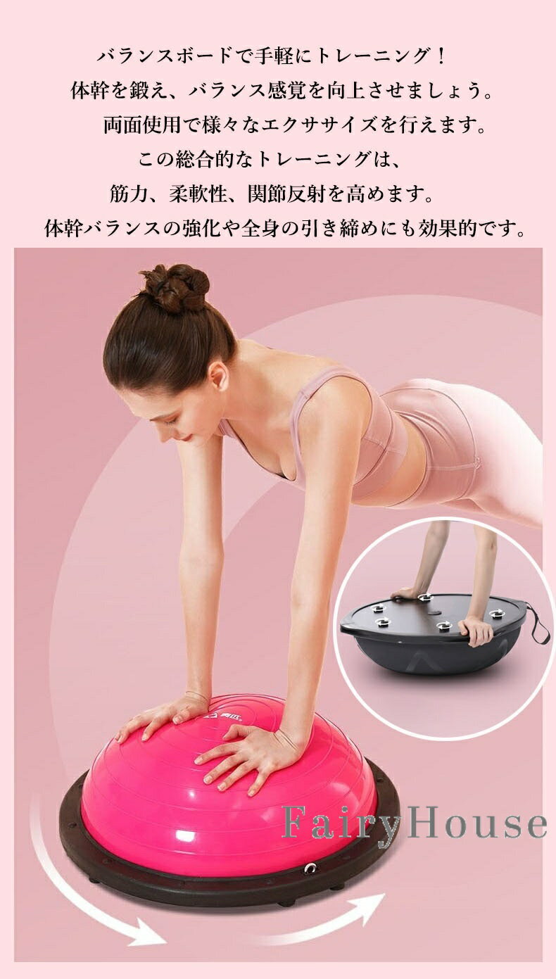 【商品番号】y750559 【製品仕様】直径が46cm/58cm/63cmあるのでゆとりがあるサイズ。アームバンド2本付属されているので、トレーニングの幅も広がります。耐荷重約150kg。 【滑り止め】体幹トレーニングになるバランスディスクの運動は思った以上に汗をかきやすく、汗で体が滑ってバランスディスクから落ちることもあるから、滑り止め加工され、安全に筋トレ 【素材】丈夫なABS素材の2.5mmボードサイド&6本ゴムの足座により、バランスドームが力を均等に負担し、安定のベースの内部が凹面デザインを採用し、踏み込むことによる不安定現象を避け、筋トレしっかりとしたサポート 【体幹トレーニング】あらゆるスポーツにおいて注目されている体幹トレーニング、バランストレーニングにお使いいただけます。これ1台でバランスを取りながらのスクワット、腹筋、背筋、腕立て伏せ等、トレーニングのバリエーションが広がります。マシントレーニングでは鍛えられない筋肉も鍛えられます 【トレーニング】3つの身体機能向上。スタビリティ(安定性)、モビリティ(可動域)、フレキシビリティ(柔軟性)。さらに、バランス能力アップ、筋力アップ、体幹強化、下半身の安定