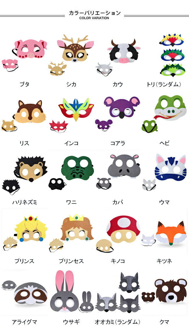 商品詳細 肌に優しい不織布を使い、幅広めのゴムベルトで着脱簡単 可愛いアニマルのデザインを取り入れ、子供用変装マスク はっきりとした色使いに上質な仕上がり、遠くから見ても分かりやすい キャラクター次第で選べる、豊かなデザインが用意されました 祝日のパーティー、イベント、お祭りや コスプレ、舞台、パフォーマンスなど、幅広い場合で使えます カラー:ブタ シカ カウ トリ(ランダム) リス インコ コアラ ヘビ ハリネズミ ワニ カバ ウマ プリンス プリンセス キノコ キツネ アライグマ ウサギ オオカミ(ランダム) クマ 素材 不織布 サイズ(cm) F F 子供用 ご注意:※素人採寸ですので、若干の誤差がございます、ご了承ください。 中国製 made in China 知っておいて頂きたいこと ※濡れたままの放置や長時間の浸漬はしないで下さい。※汗や雨で湿った状態では特に、注意が必要です。淡い色の衣類・バッグ等を一緒に使用される際にもご注意下さい。※平らな面に置いて測定しておりますので、実際に着用されるとサイズが異なる場合がございますが、予めご了承下さい。※画面上の色はブラウザや設定により、実物とは異なる場合があります。ご了承の上ご注文下さい。 メーカー希望小売価格はメーカーカタログに基づいて掲載しています■可愛いアニマルモチーフ 子供用ハーフマスク 肌に優しい不織布を使い、幅広めのゴムベルトで着脱簡単 可愛いアニマルのデザインを取り入れ、子供用変装マスク はっきりとした色使いに上質な仕上がり、遠くから見ても分かりやすい キャラクター次第で選べる、豊かなデザインが用意されました 祝日のパーティー、イベント、お祭りや コスプレ、舞台、パフォーマンスなど、幅広い場合で使えます