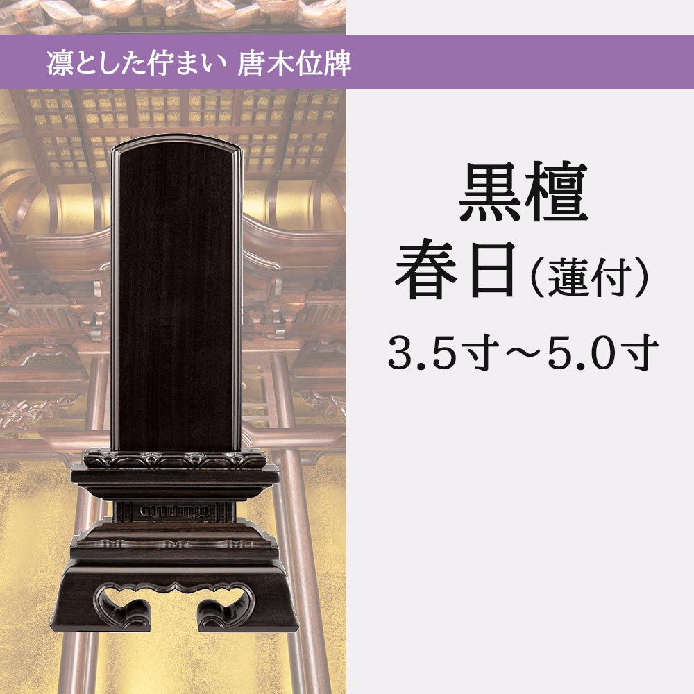 よく一緒に購入されている商品 位牌 お位牌 本位牌 名入れ込 名入れ 文字27,500円〜【黒檀 春日(蓮付)】江戸時代から伝わる歴史のある春日型。シンプルな形の札板に、さりげない台座の蓮華の装飾で、品のあるスタンダードなお位牌です。【サイズ一覧】総丈総幅奥行札巾3.5寸17.4cm9.0cm3.9cm4.6cm4.0寸19.3cm10.0cm4.3cm5.4cm4.5寸21.2cm10.6cm4.5cm5.7cm5.0寸23.2cm11.9cm5.2cm6.3cm※工芸品のため多少誤差がございます。【唐木位牌の注意点について】唐木位牌は漆塗りの位牌と異なり、木材に透明の塗装をしております。そのため、木目や色合い等、天然木材特有の商品ごとの個体差があります。木目や色合いの指定はできませんので、あらかじめご了承ください。【お位牌の選び方について】大きさはお仏壇の大きさに合わせるのが良いでしょう。一般的には4.0寸(小型仏壇)〜4.5寸(中型仏壇)、が良く選ばれているようです。5.0寸以上は大型仏壇の時に似合います。お位牌を安置するスペース(通常お仏壇の上から二段目の左右)に、選ばれたお位牌が安置できるか、しっかり測って選びましょう。【お位牌の寸法表示について】お位牌のサイズは基本的に4寸、4.5寸など「寸」が用いられます。1寸は3.03cmセンチメートルです。例えば、4寸のお位牌は「札高さ」が、4(寸)×3.03(cm)=12.12(cm)前後のお位牌、ということになります。通常、この寸法はお位牌の「札高さ」を指し、「総丈(上から下までの高さ)」を示したものではありませんのでご注意ください。【その他の注意点について】実際にお仏壇に安置する場合には「総丈」が重要となります。サイズが心配な方は、実際にお位牌を安置する場所にどれくらいの高さのお位牌が置けるかをご確認頂くと確実です。また、現在既にお祀りしている他のお位牌をお持ちの方は、そのお位牌のサイズを参考にすることが多くあります。「総丈」「札高さ」などの寸法は商品毎にページに詳しく記載しておりますので、それを参考にお決め頂くことをお勧めいたします。類似商品はこちら 位牌 お位牌 本位牌 名入れ込 名入れ 文字40,700円〜 位牌 お位牌 本位牌 名入れ込 名入れ 文字26,400円〜位牌 お位牌 本位牌 名入れ込 名入れ 文字加95,700円〜 位牌 お位牌 本位牌 名入れ込 名入れ 文字40,700円〜 位牌 お位牌 本位牌 名入れ込 名入れ 文字74,800円〜 位牌 お位牌 本位牌 名入れ込 名入れ 文字40,700円〜位牌 お位牌 本位牌 名入れ込 名入れ 文字加105,600円〜 位牌 お位牌 本位牌 名入れ込 名入れ 文字71,500円〜位牌 お位牌 本位牌 名入れ込 名入れ 文字加95,700円〜新着商品はこちら2025/11/14 神具 三方 さんぽう 檜 ひのき お供え 供6,050円2025/11/9 キャンドル ろうそく ローソク ロウソク ア550円2025/11/4 お供え かわいい お菓子 ちりめん コンパク1,100円再入荷商品はこちら※商品在庫が僅かになり再入荷した商品です。2025/11/23 線香 お線香 ミニ ミニサイズ ミニ寸 短め990円2025/11/21 線香 自宅 普段 香り せいうん セイウン 1,210円2025/11/21 仏壇 香炉 仏具 香炉 線香立て 線香 浄土4,400円2025/11/23 更新