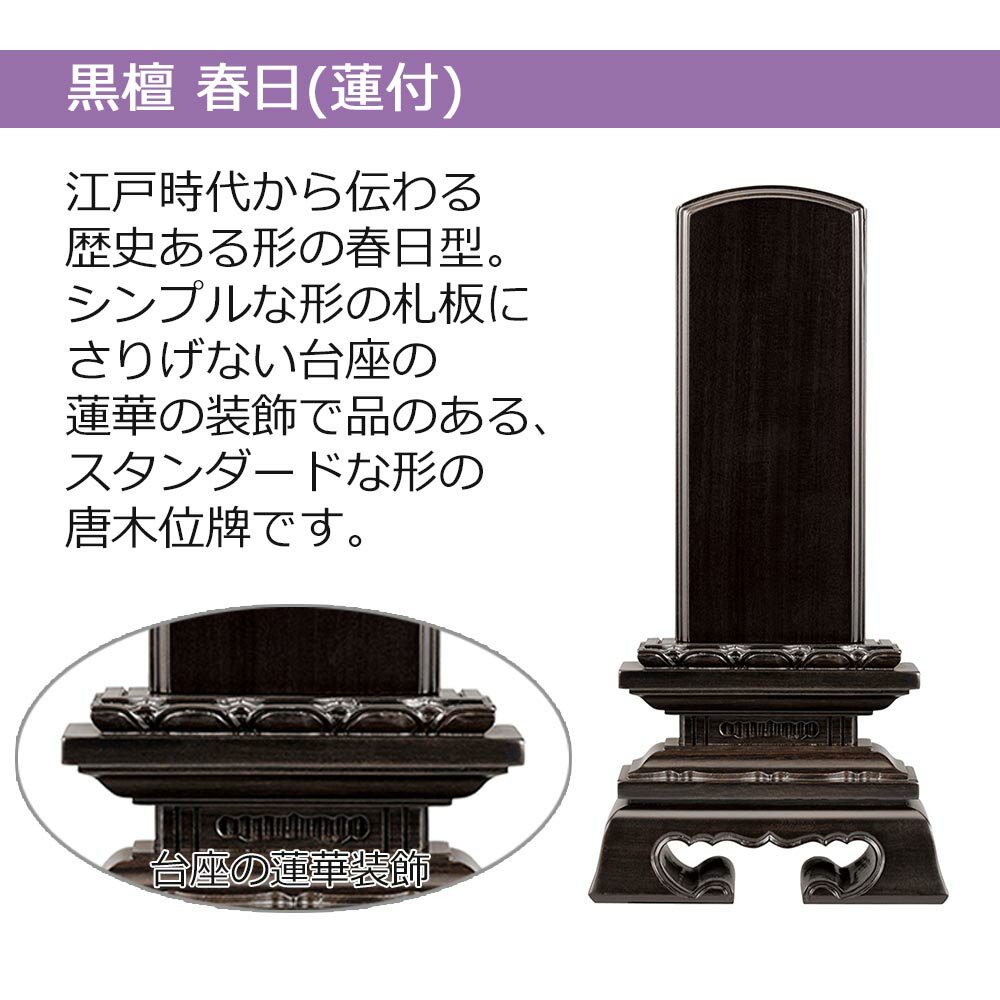 【P5倍!11/29から12/1限定】 位牌 お位牌 本位牌 名入れ込 名入れ 文字加工込 文字加工 黒檀 3.5寸 4.0寸 4.5寸 5.0寸 送料無料 送料込み 仏具 唐木位牌 四十九日 法事 こくたん 【蓮華付春日 黒檀 (総丈17.4〜23.2cm)】 お仏壇のはせがわ