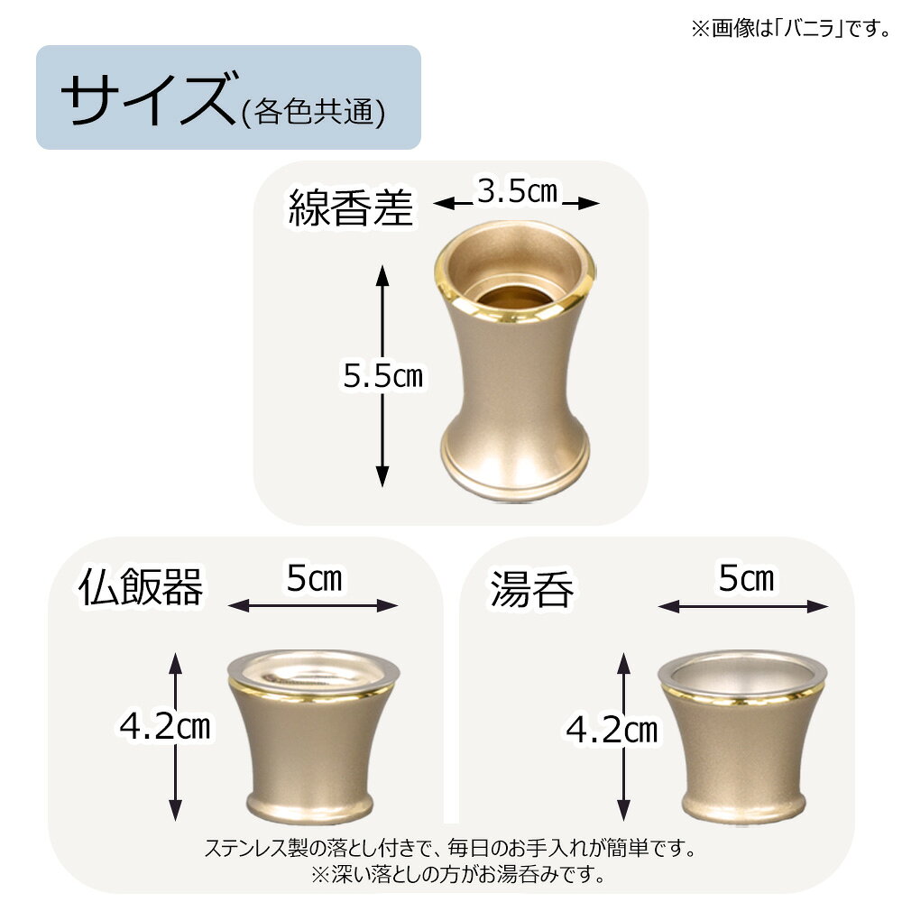 よく一緒に購入されている商品 お経 本 経本お仏壇のはせがわ385円 りん おりん 仏具 おしゃれ コンパクト チ14,300円 掛軸台 掛け軸 台 掛軸20代 30代 高さ2,200円香炉・火立・花立の基本となる3つのお仏具に仏飯器・湯呑・線香差を加えた仏具6点セットです。 シンプルながらも使いやすいよう、口が広がった形をしています。 バニラとピンクの2色をご用意いたしました。 ■六具足 リュシー バニラ 【商品サイズ】 香炉 直径(最大辺)9.2cm×高さ5.5cm 花立 直径(最大辺)6cm×高さ9.0cm 火立 直径(最大辺)4.9cm×高さ4.2cm 湯呑 直径(最大辺)5cm×高さ4.2cm 仏飯器 直径(最大辺)5cm×高さ4.2cm 線香差 直径(最大辺)3.5cm×高さ5.5cm 【素材】真鍮 ■六具足 リュシー ピンク 【商品サイズ】 香炉 直径(最大辺)9.2cm×高さ5.5cm 花立 直径(最大辺)6cm×高さ9.0cm 火立 直径(最大辺)4.9cm×高さ4.2cm 湯呑 直径(最大辺)5cm×高さ4.2cm 仏飯器 直径(最大辺)5cm×高さ4.2cm 線香差 直径(最大辺)3.5cm×高さ5.5cm 【素材】真鍮 【取扱い注意事項・お手入れ方法など】 金属磨きや薬品を使用して磨くと表面の塗膜が剥がれることがございますので、乾いた柔らかい布でお手入れください。 真鍮製のため、年月を経ることで緑青が出ることがございます。 類似商品はこちら仏具 セット モダン 仏具セット 火立 花立 42,900円 仏具セット 花立 火立て 香炉 湯呑 仏飯器19,800円 仏具セット 具足 花立 火立て 香炉 湯呑 8,030円 仏具セット 具足 花立 火立て 香炉 湯呑 6,710円 仏具セット 具足 花立 火立て 香炉 湯呑 5,500円 仏具セット 具足 花立 火立て 香炉 湯呑 6,160円 仏具 セット 仏具セット 花瓶 花立 ろうそ49,500円 仏具 セット 国産 モダン 仏具セット おし24,200円仏具セット 具足 花立 火立て 香炉 湯呑 仏16,830円新着商品はこちら2025/11/14 神具 三方 さんぽう 檜 ひのき お供え 供6,050円2025/11/9 キャンドル ろうそく ローソク ロウソク ア550円2025/11/4 お供え かわいい お菓子 ちりめん コンパク1,100円再入荷商品はこちら※商品在庫が僅かになり再入荷した商品です。2025/11/23 線香 お線香 ミニ ミニサイズ ミニ寸 短め990円2025/11/21 線香 自宅 普段 香り せいうん セイウン 1,210円2025/11/21 仏壇 香炉 仏具 香炉 線香立て 線香 浄土4,400円2025/11/24 更新本商品はWEB限定商品です。