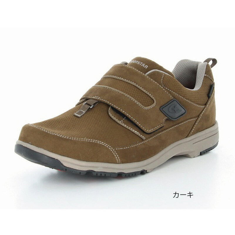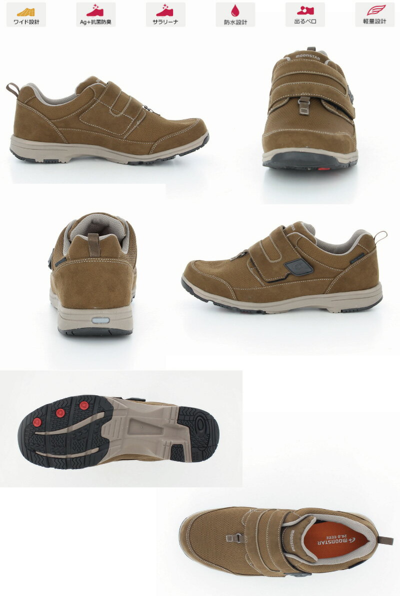 ムーンスターのメンズ防水防滑スニーカーです。 甲バンドとベロが同時に大きく開くワンアクション設計です。 履き口がガバッと大きく開くので、とても脱ぎ履きが簡単です。 さらに開けた状態をキープしてくれるので、手を離してもらくらく履けます。 雨の日でも履ける「4cm 4時間防水」機能を搭載しています。 アウトソールにはムーンスター独自開発の防滑ラバー「EVACS(R)-N」を使用しています。 軽くて屈曲性が良く、快適な履き心地です。普段履きはもちろん、ウォーキングや旅行、散歩、通院などに幅広く活躍します。 ヒールの高さは4.0cmで、重量は26.0cmで片足約270gです。 【ワイド設計】足幅の広い方に対応した商品です。 【ふわピタ中敷】低反発ウレタンを使用した中敷で、足に柔らかくフィットします。 【Ag+抗菌防臭】銀イオンの抗菌作用でにおいのもととなる菌の増殖を抑制し、防臭効果を発揮します。天然由来成分で安全です。 【サラリーナ】汗や水分を素早く吸収・拡散し、靴内をサラサラな状態に保つメッシュを使用しています。 【防水設計(4cm?4時間防水)】地面から4cm、4時間の浸漬状態での防水性を備えた防水機能です。 【セーフティブライト】光を反射する素材を装備し、優れた反射効果で夜間の歩行での安全性を高めます。 【EVACS(R)-N】一般的なソールに比べて濡れた路面、乾いた路面での防滑性の差が少ないソールです。 【出るベロ】バンドを引っ張るだけでベロも前に開くため、足を入れやすい設計です。 【軽量設計】軽くなるような工夫を施した設計です。 ●サイズ/24.5〜28.0cm(0.5cmきざみ、27.5cmはなし)、ワイズ:4E ●重さ/約270g(片足26.0cm) ●材質/表:合繊、底材:EVA・ラバー ●生産国/中国 ●防水加工 ●屋外用
