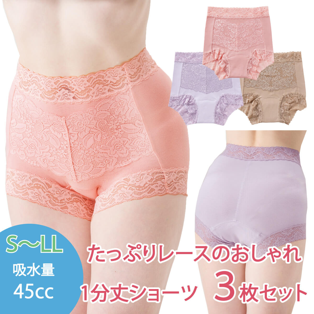 尿漏れパンツ 女性用 約45cc 3枚組 S M L LL 1分丈 軽失禁パンツ 失禁ショーツ 深履き パッド パット 妊娠後 産後 尿漏れ防止パンツ 失禁対策パンツ 介護パンツ 介護用 入院用 介護用衣料 介護用下着 高齢者 レディース 婦人 用 シニア ネコポス対応送料無料