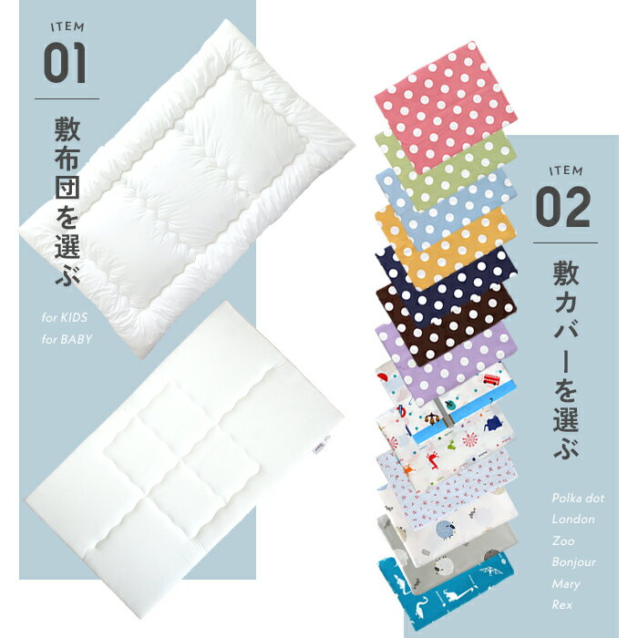 お昼寝敷布団と敷カバーのお手軽2点セット 入園準備の必需品、お昼寝布団。 空調設備の整った園が増えたことで、「掛布団はいらないな」と思われる方も多いはず。 このお昼寝布団セットは敷布団と敷カバーのみのお手軽セットです。 敷布団は、0歳児から使用できる「赤ちゃん用敷布団」と2歳から使用可能なフカフカの「園児用敷布団」の2タイプから選ぶことができます。 10種類以上ものデザインから選べる敷カバーは全て綿100%。バラエティに富んだデザインの中からお気に入りの柄を見つけてみてください。 SPEC 1)お昼寝敷布団 [園児用敷布団] 対象年齢:2歳〜 サイズ:約70×120×5cm 側生地:ポリエステル65% / 綿35% 中わた:ポリエステル100% (約0.5kg) 製品総重量:約0.8kg ※二つ折り・三つ折り可能 製造国:日本 洗濯可 [赤ちゃん用敷布団] 対象年齢:0歳〜 サイズ:約70×120×2.5cm 側生地:ポリエステル65% / 綿35% 中わた:ポリエステル100% (約0.84kg) 製品総重量:約1.0kg ※二つ折り・三つ折り可能 製造国:日本 洗濯可 2)お昼寝敷カバー size:約72×123cm 生地:綿100% (平織りブロード) 製造国:日本 洗濯可 確認事項 ・赤ちゃん用敷布団は0歳からご使用いただけますが、園児用敷布団は2歳以上のお子さま専用です。これはふんわりとした中わたを使用しており、自力で寝返りを打つことができないお子さまはうつ伏せになってしまった際に窒息の危険があるためです。対象年齢をよくご確認の上、お子さまに合った敷布団をお選びくださいませ。 ※いずれにせようつぶせ寝は窒息の危険が伴います。窒息のリスクを少しでも抑えるため、仰向け寝でのご使用を推奨しております。 ・敷カバーは片面に生地の繋ぎ部分がございます。製造上やむを得ずできてしまうものですので、繋ぎ目がある側を裏面としてご使用くださいませ。 ・お昼寝赤ちゃん用敷布団のお手入れは浴室などで手押し洗いをしてください。洗濯機での洗浄は商品破損の恐れがあります。「お昼寝掛布団」「園児用敷布団」「各種カバー」は洗濯機洗浄が可能ですが必ず洗濯ネットに入れてください。 ・届いてすぐのご使用が可能ですが、ご心配なお客様は一度水通しされてからのご使用をおすすめいたします。 ・こちらのお昼寝敷カバーはベビー固綿敷布団 (厚み5cm) には対応しておりません。 ・敷カバーはサイドファスナータイプです。 ・漂白剤はご使用にならないで下さい。 ・乾燥機などによる乾燥及び熱乾燥はお避け下さい。 ・洗濯後は放置せず形を整えてすぐに陰干ししてください。 ・お洗濯後若干の縮みがみられる場合がございます。 ・モニターによって実物の色が異なって見えることがございます。 置き配について 当店では、お客様に安全に商品をお受け取りいただくため、原則として置き配を推奨しておりません。 しかしながら、ご注文時の備考欄に「置き配希望」等のご要望を記載いただいた場合や、お客様のご自宅に「置き配希望」の表示がある場合には、配送業者の判断により置き配にてお届けとなる場合がございます。 その際、万一商品の盗難・紛失・破損等が発生いたしましても、誠に恐れ入りますが当店および配送業者による補償はいたしかねます。置き配をご指定いただく場合は、あらかじめご理解いただいたうえでご利用くださいますようお願い申し上げます。 幼児 乳児 お昼寝布団セット お昼寝布団 敷き布団 保育園 お昼寝ふとん 洗える ベビー布団 お昼寝マット お昼寝布団 バッグ 撥水 防水 お昼寝布団 カバー 日本製 お昼寝 敷布団 ベビー布団セット 保育園 布団セット ファスナー 布団カバー 綿100% 保育園 布団 赤ちゃん お昼寝マット HashkuDe 敷き布団 布団カバー 北欧 お昼寝 固綿敷布団 ベビー 敷布団 お昼寝布団 ファスナー おしゃれ おすすめ 二つ折り 三つ折り シンプル キッズ 帰省 帰郷 男の子 女の子 アニマル 動物 水玉 ドット リボン 花柄 ロンドン 車 恐竜 天然素材 自然素材 ・ベビーから園児まで使える三層構造の敷布団はこちらをclick