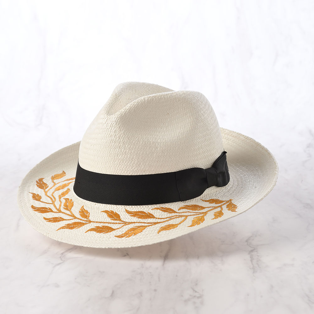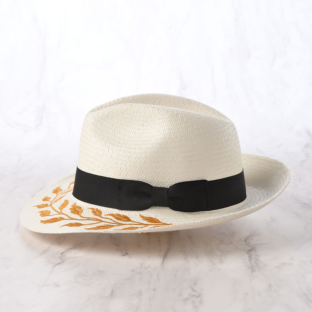 関連ワード:パナマハット パナマ帽子 パナマ帽 panamahat 中折れハット 中折れ帽 フェドラ フェドーラ fedora トキヤ草 春 夏 帽子 ハット 紳士帽 安い お手頃 高品質 リーズナブル コスパ 麦わら帽子 ストローハット メンズ レディース ユニセックス 男性 女性 大きいサイズ 紫外線 UV対策 ハンドメイド 手作り 手編み おしゃれ 人気 ファッション小物 エクアドル製 エロイベルナール eloybernal 父の日 敬老の日 誕生日 プレゼント ギフト仕様 カラー:ホワイト(ブリーチ) リボンの色:ブラック ブランド:ELOY BERNAL(エロイ ベルナール)/エクアドル 素材:天然トキヤ草100% 編み方:Llano(網代編み) 編み目細かさ(グレード):スペシャル つばの広さ:約6〜7cm 重さ:約80g エクアドル製 パナマハット 着用シーズン:春〜夏 ※サイズ調整テープ(長さ30cm)が1個付属します。 ■ サイズの目安 実寸:M:57cm、L:59cm、XL:61cm ■ 取り扱いのご注意 フロントピンチ裏にシリコン加工しています。[詳細] リボンのズレ防止のための縫い付け箇所があります。[詳細] 100%天然、手作りのため、ゆがみやシミがみられることがあります。 時間の経過および光への露出により、色味が変わることがあります。天然素材ならではの経年変化をお楽しみください。 この夏の主役におどり出る、クールでゴージャスな刺繍デザインの贅沢パナマハット。 ELOY BERNAL(エロイ ベルナール)のLEAF(リーフ)は、ワンランク上の美しい網代編みならではの上質感はそのままに、ブリム上面の前側にゴールド感のある糸の刺繍でボタニカルな絵柄を大胆に描き出した、他にない特別感のあるパナマハットです。 ひときわ目に留まるのは、やはりつば上にあしらわれた刺繍。ゴールド寄りの黄土色といった色味の糸により、ボタニカルな絵柄がダイナミックに描かれています。こうした刺繍入りのパナマ帽は珍しいため、定番・王道では満足できないあなたにおすすめできます。 ただ、単に奇をてらったインパクト重視のアイテムに止まっていないのが、LEAF(リーフ)のすごいところです。帽体は、天然のトキヤ草をワンランク上の美しい網代編みで仕立てています。気持ち長めに感じられるブリムは、流麗なスナップブリムのスタイルです。 さらに、美しくブリーチされたホワイトの帽体と黒リボンは、パナマハットの王道の配色です。つば上の刺繍は、スナップブリムの効果により、着用時には斜めにチラリと覗くような雰囲気になります。このため、見た目は意外と派手すぎず、むしろ驚くほど上品です。 ELOY BERNAL(エロイ ベルナール)のLEAF(リーフ)は、華やかさと落ち着きが絶妙に共存したパナマハットです。夏の装いに、自分だけの個性をさりげなく添えたい方にぴったり。カジュアルからキレイめスタイルまでマッチする、汎用性の高さも魅力です。 パナマハット発祥地に居を構えるカラフル・パナマハットの名手、ELOY BERNAL(エロイ ベルナール)。 1976年創業のELOY BERNAL(エロイ ベルナール)は、パナマハットの発祥地にして本場エクアドルのブランドです。パナマハットの街として知られる都市クエンカに居を構え、米国、カナダ、メキシコ、ブラジル、イングランド、オーストラリア等の各国と取引を行う国際的企業でもあります。 ELOY BERNAL(エロイ ベルナール)のパナマハット・コレクションは、多彩なカラーが特徴です。パナマハットの伝統的スタイルと現代のモダンなニーズを融合したELOY BERNAL(エロイ ベルナール)のカラフル・パナマハットは高い評価を得ており、業界に新たな風を吹き込むパナマハットを意欲的に制作するブランドとして注目を浴びています。 本場に伝わる伝統技術によって作られたパナマハットを、ぜひご自身の目でお確かめください。 エクアドルの歴史と伝統を受け継ぐ匠の技、ELOY BERNAL(エロイ ベルナール)のパナマハット作り。 ELOY BERNAL(エロイ ベルナール)のパナマハットは、発祥地エクアドルに受け継がれた職人技をもって生み出されています。手間暇のかかる伝統的手法を用いて作られたパナマハットは、丈夫さと美しさを兼ね備え、大人のファッションに相応しい良品に仕上がります。 特筆すべきはその彩りです。ELOY BERNAL(エロイ ベルナール)のパナマハットは、ブリーチ(脱色)した定番の色から、ハッと目を引く鮮烈な色のものまで、多岐に渡ります。あらゆる彩りの繊維を組み合わせる事で、ELOY BERNAL(エロイ ベルナール)はバラエティーに富んだデザインのパナマハットを創り出します。 豊富な色のパナマハットは、選ぶ楽しみ、装う喜びを生み出し、夏を鮮やかに彩ります。本場エクアドルから届いたカラフル・パナマハットは、他には真似のできない貴方だけの個性を演出してくれる事でしょう。 中心高さの数値はまあまあですが、帽子内側の空間がやや狭いため、人によってはかぶり心地が浅めに感じられるかもしれません。試着して選ぶことをおすすめします。ブリム長さは約6.5cmと「普通」ですが、気持ち長めに感じられてスタイリッシュな雰囲気ですね。