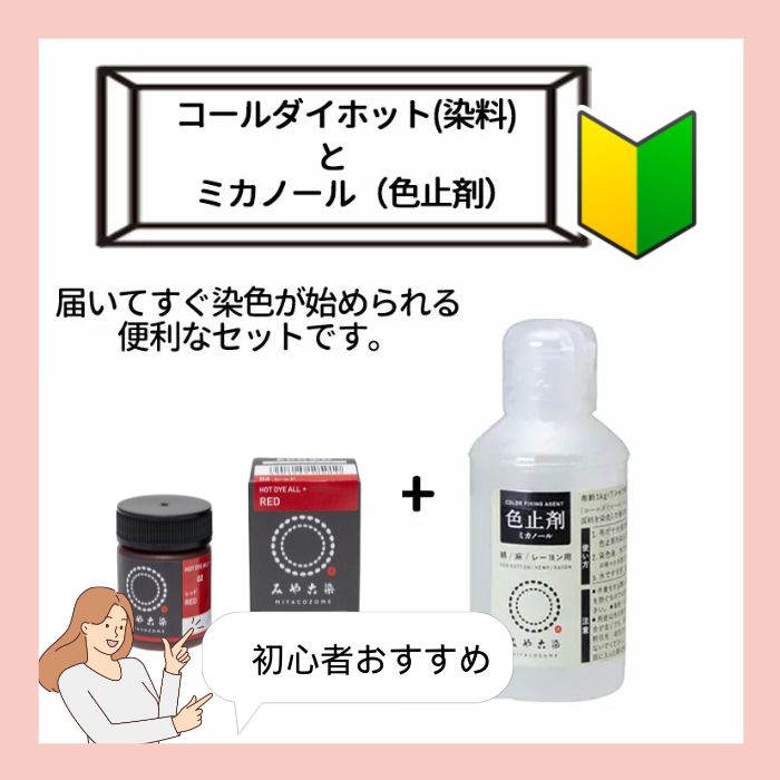 濃く染めたい方はこちらのコールダイホットが適しています。85℃以上のお湯を使い綿・麻・レーヨンから絹・毛(ウール)・ナイロンやポリエステル・ポリエステル 混紡品まできれいに染まるECO染料です。 ナイロンやポリエステルボタン・樹脂成型品にも使えます。 初心者の方には色止め剤とのセット販売をおすすめいたします。 コールダイホット(お客様希望色)とミカノール50mlがセットになっていますので、すぐに染色を始められます。 ポリエステル混紡品には濃色促進剤をご一緒にお使いください 植物繊維の色止めにはミカノール単品はこちらから 商品は通常1-3営業日で弊店より発送いたします。 宅急便コンパクト(一部の地域では日本郵便レターパック)でのお届けです。レターパックはお時間の指定が承れません。 何卒ご理解の程お願い申し上げます。 ※ご注文商品の変更・キャンセル、お客様都合の返品はご容赦いただいております。 コールダイホット300gは宅急便でのお届けです。一部の地域はレターパックでのお届けです。 レターパックは日時やお届け時間のご指定は承れません。ご了承くださいませ。 ※ご注文商品の変更・キャンセルはご容赦いただいております。 お客様都合の返品には対応しておりません。
