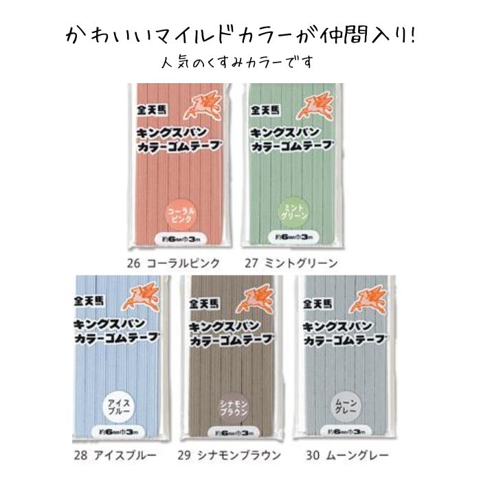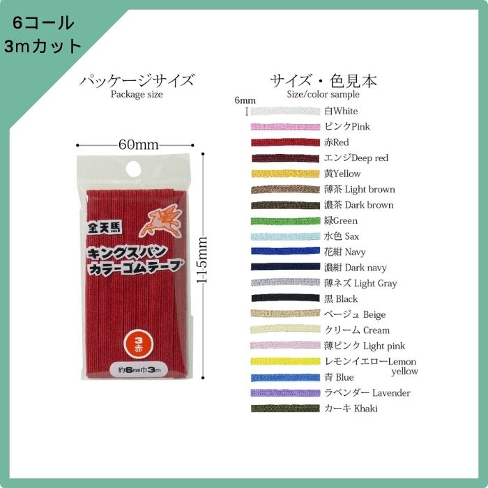 【ポイント10倍 12/11 01:59迄】平ゴム キングスパンカラーゴムテープ 6コール 6mm幅 3m巻 または 30m綛 金天馬