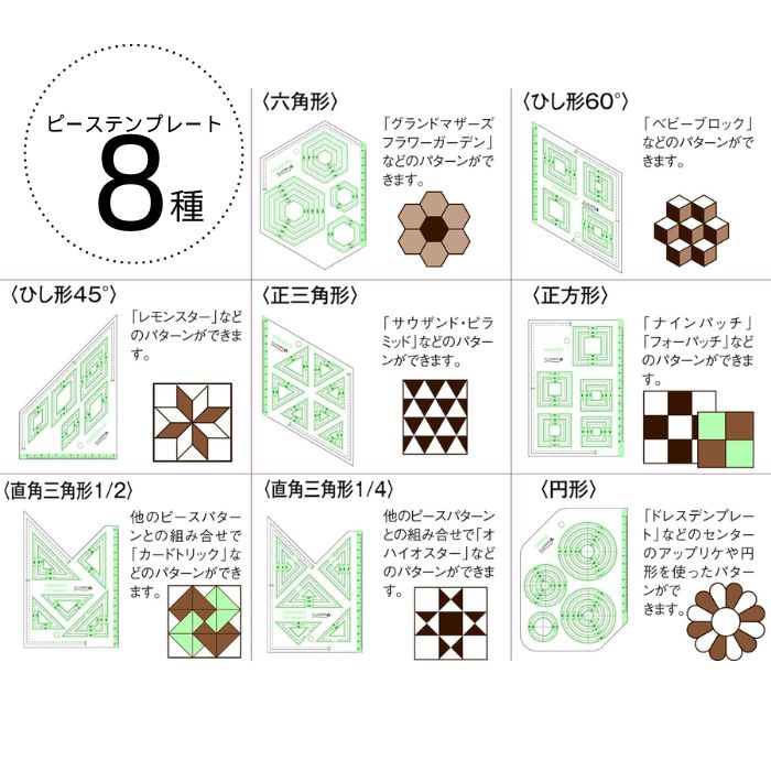 ピーステンプレート 各種 六角形 ひし形 正三角形 正方形 直角三角形 円形 クロバー パッチワーク ピースパターン
