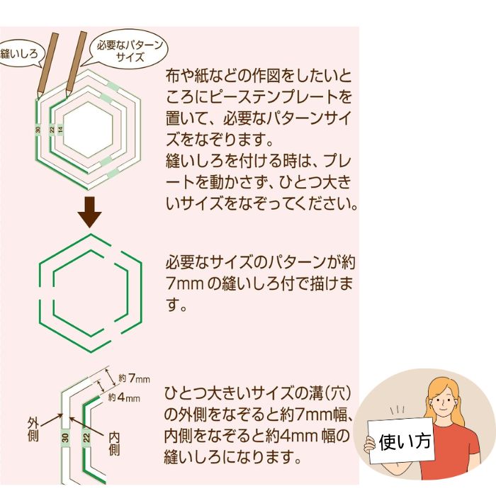ピースパターンと縫いしろが同時に描けるテンプレートです 六角形 ひし形60° ひし形45°正三角形 正方形 直角三角形1/2 直角三角形1/4 円形 8種のテンプレートが揃っています。 布や紙などの作図をしたいところにピーステンプレートを置いて必要なパターンサイズをなぞるだけ。簡単にピースの作成ができる便利なアイテムです。 こちらの商品は通常2-3営業日位で発送いたします。 ゆうパケットで発送いたします。 ポスト投函となりますのでポストのご確認をお願いいたします。 ※ご注文商品の変更・キャンセルはご容赦いただいております。 お客様都合の返品には対応しておりません。