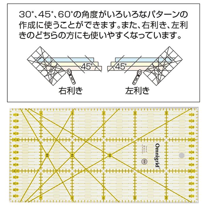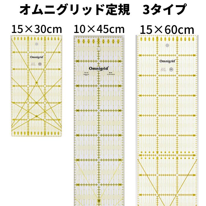 キルターの愛用品 オムニグリッド定規 本場アメリカでもピース作りなどに多くのキルターが使っています。黄色いラインの上に黒いラインがあり、濃い生地の上でも見やすくなっています。 右利きも左ききの人も使いやすい30度 45度 60度の角度線は左右対称になっています。色々なパターンの作成にとても便利です。 オムニグリッド定規は15×30cm 10×45cm 15×65cm の3種類あります。 こちらは取り寄せ商品でございます。通常2-3営業日で発送をいたします。 57-622 15×30cmはゆうパケットポスト投函 57-625 10×45cmは宅配便 57-623 15×60cmは宅配便です。
