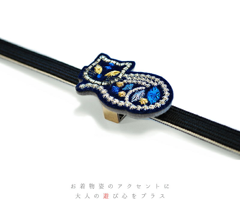 在庫処分 帯留 猫 ねこ ネコ cat 紺 青 ネイビー ベロア 刺繍 ラインストーン ベネチかわいい カジュアル 帯締め 和装 着物 No.8-1735