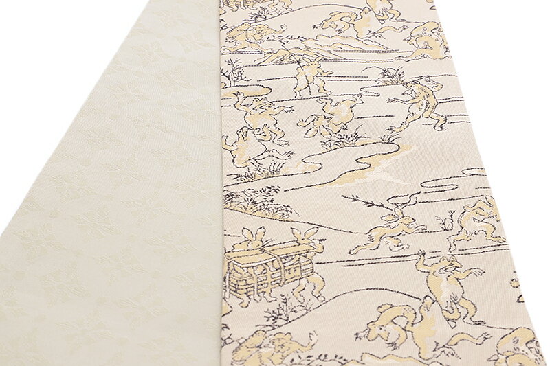 半幅帯 浴衣帯 ゆかた帯 正絹 桐生織 生成り ベージュ 鳥獣戯画 和柄 リバーシブル お洒落 新品 細帯 日本製 カジュアル No.10-5660