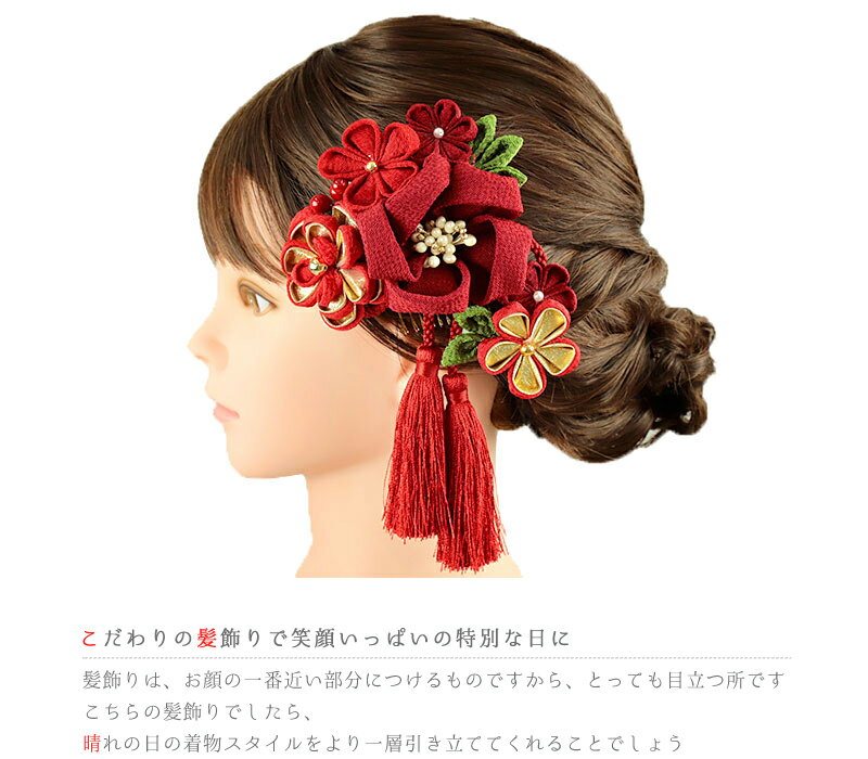 髪飾り 成人式 つまみ細工 振袖 和装 袴 2点セット 花 ちりめん 赤 ゴールド つまみ細工 組紐 房 パールビーズ 花しらべ 江戸つまみ簪 コーム Uピン 大人可愛い 日本製 お洒落 七五三 浴衣 お祭り No.12-0861