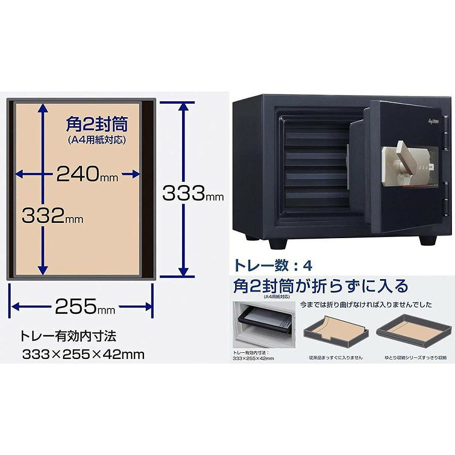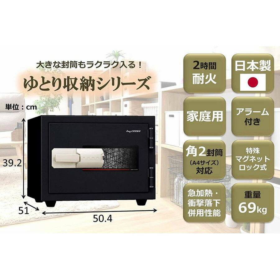 【ご注文前に必ずご確認下さい】 ※弊社発送の通常商品、他メーカー直送商品との混合注文・同梱発送はできかねます。 ※ご注文確定後のキャンセルは承れません。 ※配達日程の打ち合わせの為、ご連絡させて頂きます。打ち合わせをさせて頂くご連絡先(ご注文者様もしくはお届け先様)を選択肢よりお選びください。 ※特殊な運送便でのお届けとなる為、細かな時間指定のできない商品となります。 ※お届け先が沖縄・離島の場合、事前にお問い合わせください。 金庫の老舗メーカーが手がける国産の耐火金庫です。いつ起こるか分からない自然災害、火災などに備え、一家に一台あると安心です。大切な書類、小物、思い出の品などの保管にいかがでしょうか。A4サイズ対応の角2封筒もらくらく入る「ゆとり収納」シリーズの、特殊マグネット錠タイプです。 マグネットの特性を生かした高性能の錠前で、煩わしい解錠操作やダイヤル操作番号を覚える必要もなく、ワンタッチで開閉できる耐火金庫です。 【仕様】 ■本体サイズ:幅50.4×奥行51×高さ39.2cm ■内寸:幅34.8×奥行29.5×高さ21.4cm ■重量:69kg ■容量:21.9L ■原産国:日本 ■耐火性能:一般紙用2時間耐火性能 ■急加熱・衝撃落下併用試験合格 ■警報機付き ■角2封筒収納サイズトレー4枚付き