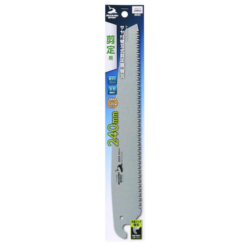 【用途】生木の根切用鋸。【機能・特徴】根切り専用の鋸です。土や砂に強くするために耐摩耗性を高めています。【仕様】●刃長:240mm。●目数(30mm):8枚目。●刃厚:1.4mm。●切幅:1.3mm。●全長:収納時410mm(鞘入り時)・使用時370mm。●重量:335g。●アサリ無し・衝撃焼入・未来目。●ゴムハンドル・ハードクロームメッキ。【材質】●刃:鋼(SK-4)。●柄:エラストマー樹脂。【注意事項・その他】刃物につき取り扱いには十分ご注意ください。替刃は純正製品を使用してください。