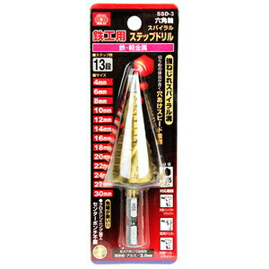 【用途】薄鉄板(一般鋼)・アルミなどの穴あけ・穴拡大・バリ取り作業。【機能・特徴】独自の刃先角度設計により切削抵抗を軽減し、バッテリー効率が良く充電インパクトドライバーでの使用に最適です。刃先シンニング加工により、材料への食いつきが良くセンターポンチ不要です。チタンコーティング仕様により耐熱性に優れ、長寿命です。【仕様】●サイズ:4・6・8・10・12・14・16・18・20・22・24・27・30mm。●6.35mm六角軸。●段数:13段。●最大穴あけ可能板厚:薄鉄板・アルミ2.0mm以下。●対応機種:充電インパクトドライバー・充電ドリルドライバー・電気ドリル。【材質】●ドリル:ハイス鋼。【注意事項・その他】作業中は必ず保護メガネ、マスク、安全手袋を着用してください。穴あけ中、無理な押しつけや左右にゆらしてコジあけたりはしないでください。使用条件を超える穴あけは製品の破損につながりますのでおやめください。充電インパクトドライバーのご使用は軸折れや刃先破損の恐れがありますので、負荷のかけすぎはおやめ下さい。関連商品 スパイラルステップドリルAL-1S2950円 スパイラルステップドリルAL-2S4280円 スパイラルステップドリルAL-3S6380円 スパイラルステップドリルAL-4S2950円 スパイラルステップドリルAL-5S4928円