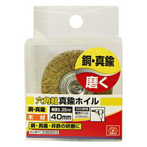 【用途】鉄のサビ落とし・塗装はがし・バリ取り、パイプの内面研磨クリーニング、変木・木の根などの仕上げ。【機能・特徴】変木・木の根などの仕上げにも使用出来ます。6.35mmの六角軸のため、インパクトドライバーにワンタッチで取付け可能です。水平ドリルスタンド、ドリルクランプを併用すれば、一層用途が広がります。線のこしが柔らかく、研磨物を傷つけにくいです。【仕様】●軸径:6.35mm六角軸。●直径:約40mm。●対応機種:電気ドリル・インパクトドライバー。【材質】●真鍮製。【注意事項・その他】インパクトドライバーを使用するときは、負荷をかけ過ぎないようにご注意下さい。保護メガネなど安全保護具を着用して正しく安全にご使用下さい。