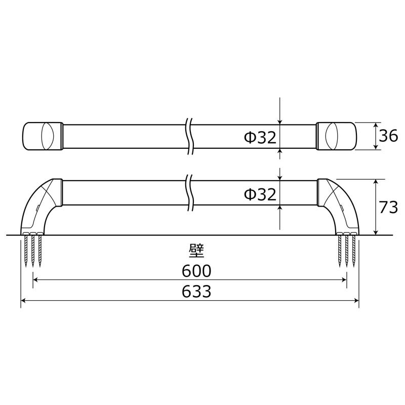 握って安心!タテ、ヨコ兼用ストレートタイプ。壁のうしろの見えない柱がわかる”ピン付き”手すり!【サイズ】太さ(mm):32 長さ(mm):600【材質】丸棒/ゴム集成材(塗装)、ブラケット/ZDC2(亜鉛ダイカスト・シルバー塗装)、ブラケットカバー/PP(ポリプロピレン)、付属ビス/ナベタッピング4X50mm(8本)、下地探しピン/ABS樹脂(針長/22mm)【仕様・タイプ】手すり持ち手:ストレートタイプ