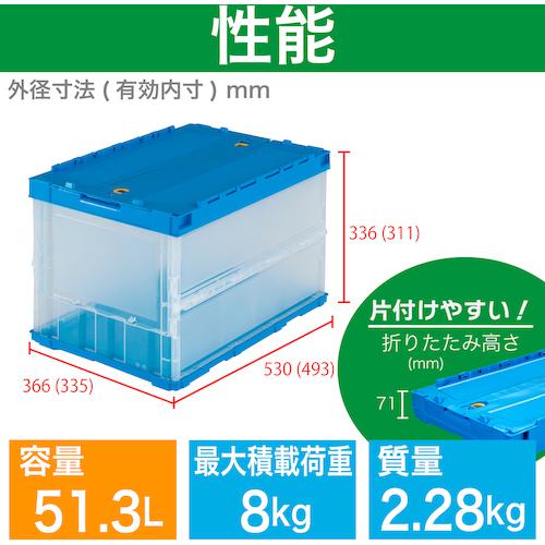 《メーカー》トラスコ中山(株)《品番》TR-C50B《特長》●シボ加工を設けているので、ラベルを貼ることができ、ラベルののりを残すことなくはがせます。●折りたたんだ時の高さを最大限まで追求、従来タイプに比べて最大35%低く、これにより輸送運賃・保管スペースを大幅に削減することができます。●スライドロックを設けていますので、内容物を安心して輸送することができます。●組み立て時も、折りたたみ時にも積み重ねができ荷崩れの心配がありません。《用途》●商品や部品・備品の配送および保管・管理。●内容物の種類・大きさが一定でない荷物の配送に最適。《仕様》●容量(L):51.3●色:半透明●外形寸法(mm)間口:530●外形寸法(mm)奥行:366●外形寸法(mm)高さ:336●有効内寸(mm)間口:493●有効内寸(mm)奥行:335●有効内寸(mm)高さ:311●折りたたみ高さ(mm):71●最大積載荷重(kg):8●シボ加工:6ヵ所《仕様2》●食品衛生法適合(ポジティブリスト適合)●最大積載荷重:8kg●色相:4側面半透明、フタと上枠・底板はブルー●スライドロックフタ付《原産国(名称)》日本《材質/仕上》●ポリプロピレン(PP)《セット内容/付属品》《注意》●提供不可:ミルシート《JANコード》4989999751390《本体質量》2.28kgTRUSCO オリコン 薄型折りたたみコンテナ 50L ロックフタ付 半透明 透明〔品番:TR-C50B〕[注番:2997631][本体質量:2.28kg]《包装時基本サイズ:530.00×365.00×65.00》〔包装時質量:2280.0g〕分類》物流・保管用品》コンテナ・パレット》折りたたみコンテナ☆納期情報:取寄管理コード(006) メーカー直送品 (欠品の場合有り)