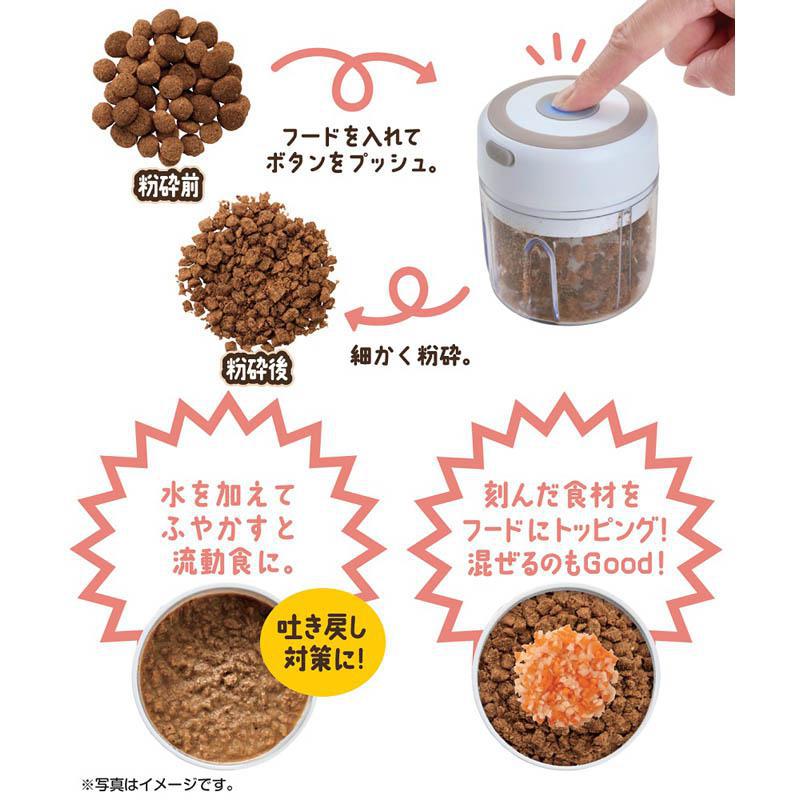 らくらくブレンダーミニ ボタンひとつで小さく刻める。毎日の食事作りが時短に! ポイント ・ドライフードや食材を食べやすい大きさにカット ・細かくしたドライフードは、水やミルクでふやかしやすい ・苦手な味のサプリメント等も一緒にまぜやすい ・安全装置で誤作動を防止 フタがカップから離れるとセンサーが反応し、回転が止まります。 仕様 材質 フタ:ABS カップ:AS カット刃:ステンレス 容量 約200ml 規格 USB充電式 ※USBケーブル付き。USBアダプターは付属していません。 必ず 5V 1A〜2.1A を使用してください。 本体サイズ(mm) W87 × D87 × H97 対象動物 シニア/幼いペット全般 JAN 4906456574958 品番 DA-281 ご注意 ・初回ご使用前に各部品をやさしく洗浄してください。 ・長時間の連続運転は避け、適宜休ませてください。 ・必ずフタを正しく装着してから使用してください。