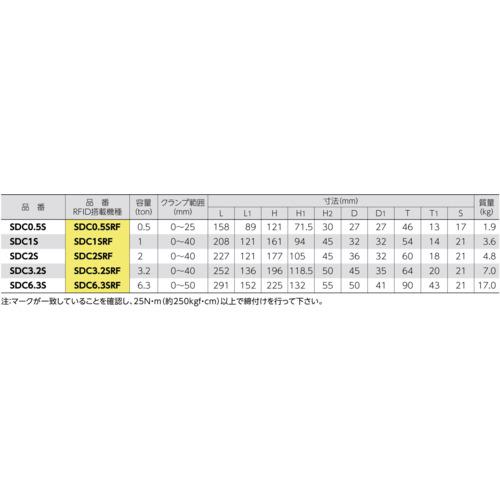 《メーカー》(株)スーパーツール《品番》SDC0.5SRF《特長》●円形カムの作動は、マークにより確認ができます。●マークは蓄光塗装により視認性に優れています。●吊り上げ荷重に比例して円形カムが傾いて食い込み接面が大きくなり、強固にグリップします。●シャックル取付け部が縦横2箇所に設けてありますので、作業状態により選択することが出来ます。●本体に内蔵された強力なバネにより、スクリューの緩みを防止します。●円形カムは、ばねの力で常に正常な姿に戻る機構に成っています。●本体は特殊合金鋼の型鍛造品で最適な熱処理が施されていますので、強靭で耐久性は抜群です。●NETIS(国土交通省 新技術情報提供システム)登録商品です。●S・M・A・Я・T管理アプリに対応し、無料で登録できます。《用途》●土木、建設、鉄鋼、造船、製缶業など、各種業界における、鋼板・形鋼などの吊り上げ・吊り下げ・横引き・反転作業など。●治具としてチェーンブロックやホイスト等の吊下げや鋼材等の引張り作業に。《仕様》●基本使用荷重(t):0.5●クランプ範囲(mm):0〜25●寸法(mm)D:27●寸法(mm)D2:27●寸法(mm)H:121●寸法(mm)H2:55●寸法(mm)L:158●高さ(mm):121●幅(mm):158《仕様2》《原産国(名称)》日本《材質/仕上》●特殊鋼《セット内容/付属品》《注意》《JANコード》4967521454339《本体質量》1.9kgスーパー ねじ式クランプ スクリューカムクランプ(ダブル・アイ型)ツイストカム式 基本使用荷重0.5t(RFIDチップ搭載/S・M・A・Я・T管理アプリ対応)〔品番:SDC0.5SRF〕[注番:6607058][本体質量:1.9kg]《包装時基本サイズ:210.00×145.00×60.00》〔包装時質量:1.9kg〕分類》荷役用品》吊りクランプ・スリング・荷締機》吊りクランプ☆納期情報:取寄管理コード(006) メーカー直送品 (欠品の場合有り)