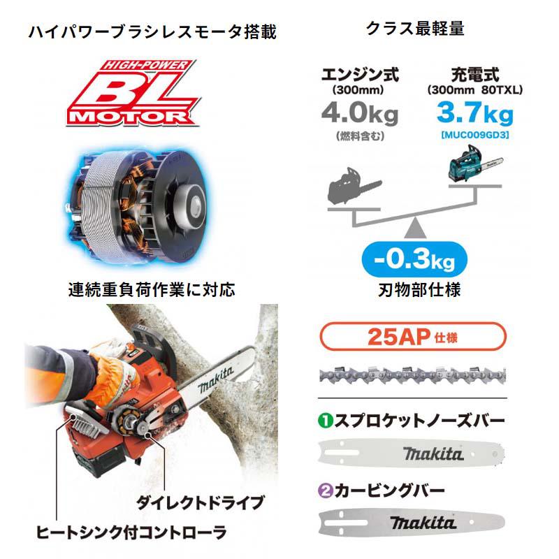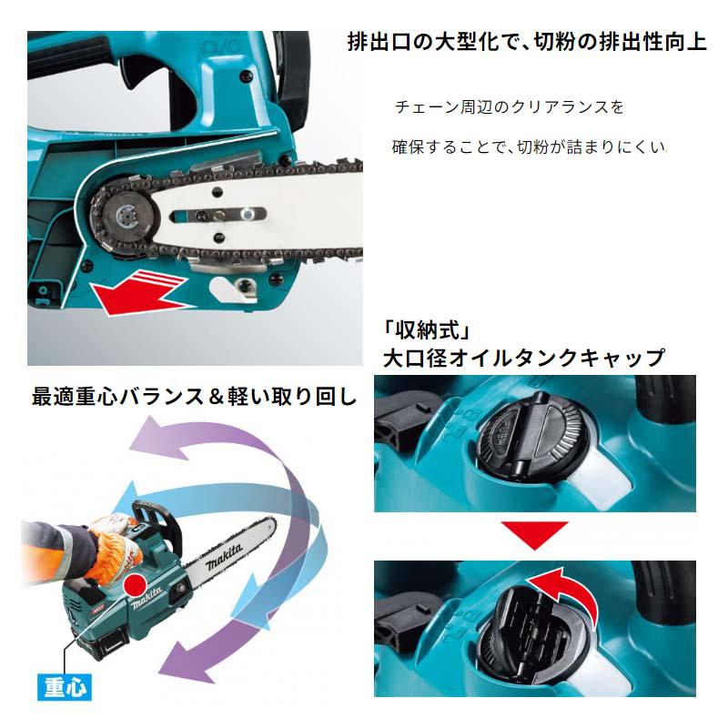 エンジン式30mLクラスハイパワーブラシレスモータ搭載【特徴】・40Vmaxモデル、ハイパワー・30mLエンジン式クラス、25AP仕様・ハイパワーブラシレスモータ搭載・連続重負荷作業に対応・モータがチェーンを直接駆動、ダイレクトドライブ・モータとコントローラを強制冷却、ヒートシンク付コントローラ・クラス最軽量※30mLクラスプロ向け同出力帯チェンソーにおいて。2021年10月現在、当社調べ。バッテリBL4025含む。ガイドバー、チェーン刃、チェーンオイル含まず。・高い防水性能・刃物部仕様・チェーン刃25AP仕様(1)スプロケットノーズバー:先端部のスプロケット(歯車)でチェーンの回転抵抗を減らし、パワーを最大限に伝達(2)カービングバー:キックバックの発生が少なく、枝打ちなどの細かい作業に最適・刃数が多く、軽い滑らかな切れ味・排出口の大型化で、切粉の排出性向上・最適重心バランス&軽い取り回し・「収納式」大口径オイルタンクキャップ・枝の引っ掛かりを低減・大型化で給油がラク・ワンタッチで電源ON・脱落防止ナット・ナットがカバーから脱落しないため、不意な紛失を防止・吊り下げ用フック・ガイドバーが下を向き、スムーズに吊り下げ可能【仕様】・切断部ガイドバー長さ:250mmチェーンスピード:0〜24.8m/sチェーン形式:25AP-60・商品寸法:長さ266x幅194x高さ227mm(チェーン刃、ガイドバー含まず。バッテリ含む)・質量:3.7kg(チェーン刃、ガイドバー、バッテリ含む) 【標準付属品】 ・チェーンオイル ・チェーンカバー ・レンチ13-16 ・丸型ヤスリ4