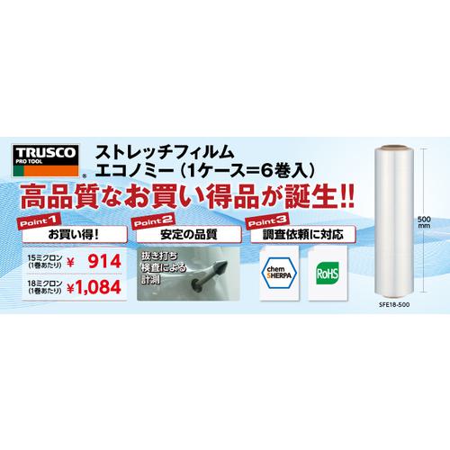 ■TRUSCO ストレッチフィルム エコノミー 厚さ18ミクロン×幅500mm×長さ300m 1ケース=6巻入〔品番:SFE18500〕【6642896:0】[店頭受取不可]