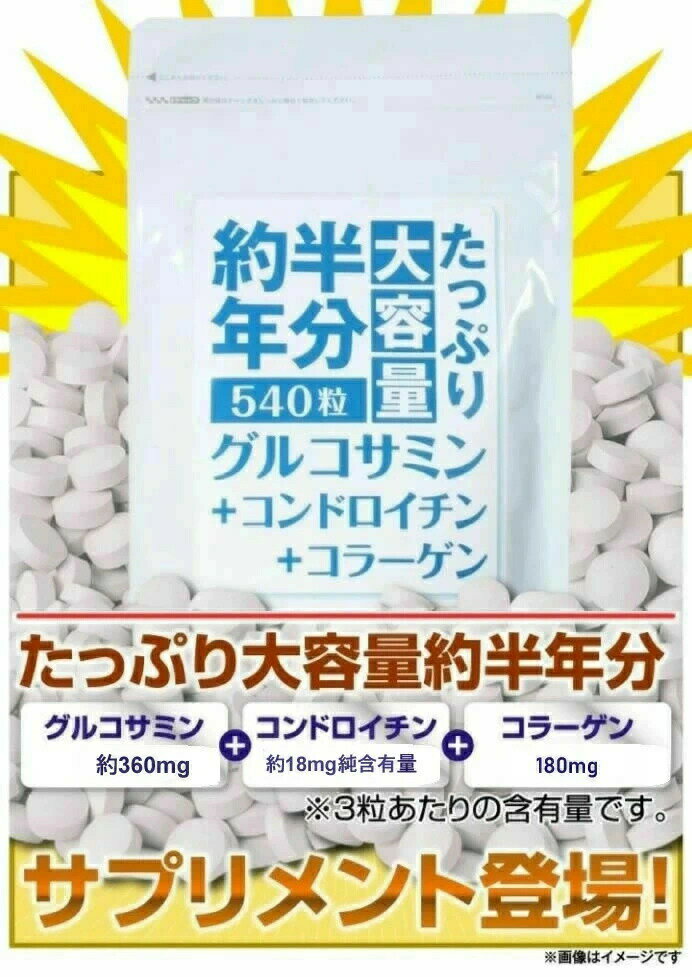 ※ゆうパケット送料無料※ 『約半年分 たっぷり大容量 グルコサミン+コンドロイチン+コラーゲン 540粒』 美容 健康 軟骨 成分 膝 関節 股関節 サプリメント