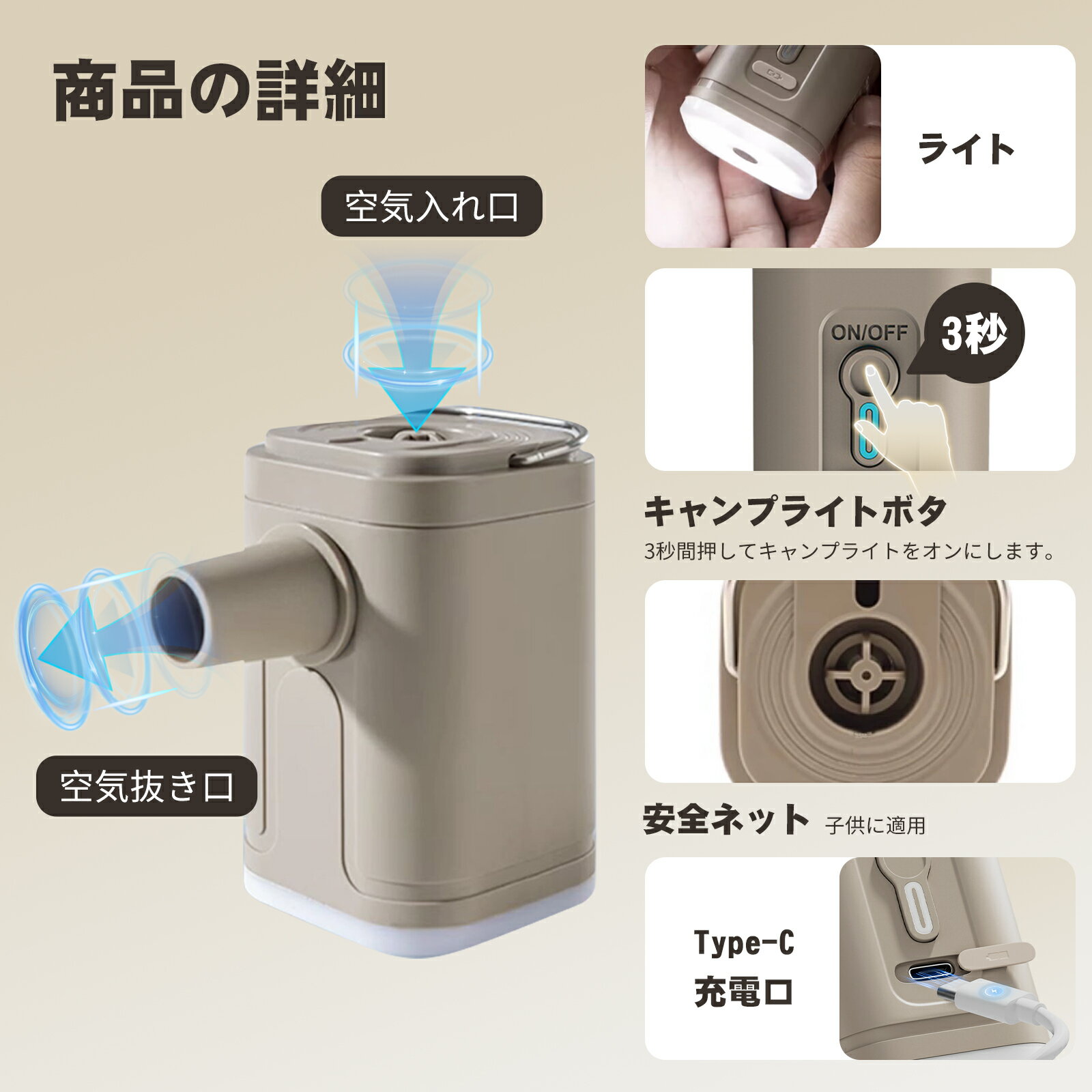 プール 空気入れ 電動 エアーポンプ ライト付き コンパクト キャンプ用品 アウトドア用エアーポンプ 1200mAH Type-C充電式 エアーポンプ 空気入れ 空気抜く プール 浮き輪 圧縮袋 インフレーターマット 対応 日本語説明書付き