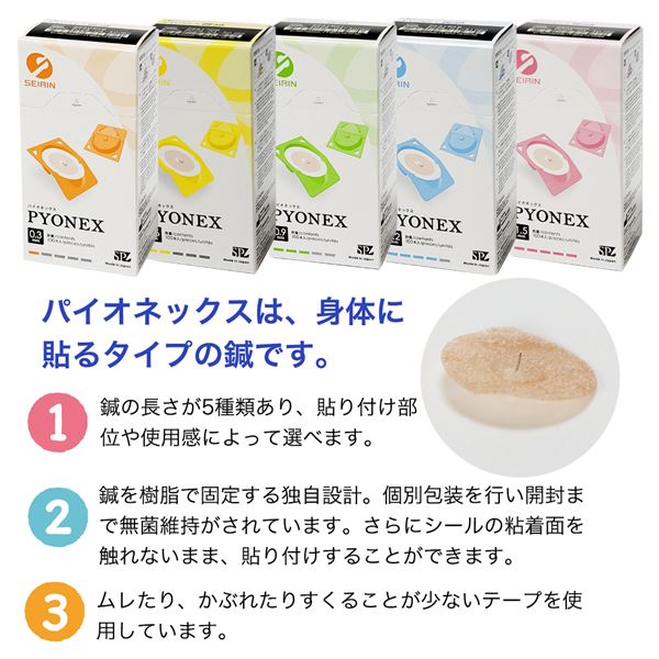 ★出荷日数目安 こちらの商品は、通常1営業日で出荷となります。 商品名 セイリン パイオネックス PYONEX 円皮鍼 1.2mm ブルー 100本入り [管理医療機器]【送料無料】 内容量 100本入 メーカー名 セイリン ブランド パイオネックス サイズ 鍼長さ 1.2mm テープ径 12mm 素材・原材料・成分 鍼体:ステンレス鋼 ご注意 はり師、医師または歯科医師の資格をお持ちの方以外には販売できません。 その他 ◆医療機器認証番号 管理医療機器 15500BZZ00806000 原産国または製造国 日本 広告文責:株式会社健人 電話番号 048-252-3939 区分:衛生用品 サブカテゴリー: 鍼 関連ワード: エンピシン/鍼/美容/ハリ/鍼シール/置き針/置鍼/鍼灸針シール/円皮針/ひ鍼 こちらの商品もおすすめ セイリン パイオネックス PYONEX 円皮鍼 1.2mm ブルー 100本入り×2個セット セイリン パイオネックス PYONEX 円皮鍼 1.2mm ブルー 100本入り×5個セット セイリン パイオネックス PYONEX 円皮鍼 1.5mm ピンク 100本入り セイリン パイオネックス PYONEX 円皮鍼 0.9mm グリーン 100本入り セイリン パイオネックス PYONEX 円皮鍼 0.6mm イエロー 100本入り セイリン パイオネックス PYONEX 円皮鍼 0.3mm オレンジ 100本入り セイリン パイオネックス PYONEX 円皮鍼 セイリン パイオネックス PYONEX 円皮鍼 1.2mm ブルー 100本入り [管理医療機器] ページトップへセイリン パイオネックス PYONEX 円皮鍼 1.2mm ブルー 100本入り [管理医療機器] 「セイリン パイオネックス PYONEX 円皮鍼 1.2mm ブルー 100本入り」は、身体に貼るタイプの鍼(円皮鍼)です。衛生面を考え、鍼を樹脂で固定する独自の設計を採用しています。個別包装をおこない、開封まで無菌維持がされています。また、取り出す際にテープの粘着面が指に触れません。通気性のよいテープをしているので、ムレたりかぶれたりが少ないです。日本製。 ★ブルー 1.2mmタイプ