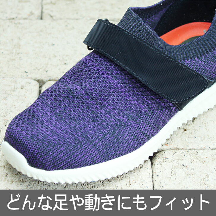 商品の仕様 ●サイズ/S:22.0〜22.5cmM:23.0〜23.5cmL:24.0〜24.5cmLL:25.0〜25.5cm、3L:26.0〜26.5cm、4L:27.0〜27.5cm ●ワイズ/3〜7E対応可能 ●素材/甲材:ニット・合成皮革、底部:EVA・合成ゴム ●重さ/約160g(片足) 商品の説明 今までにないフィット感!ストレッチスニーカー ・ストレッチニットアッパーが、足に吸いつくフィット感で足全体を包みます。 ・どのような足の形状や動きにもフィットするストレスフリーなニット編みと甲部からかかと部にかけて安定感を高めるクォーターパーツをデザイン良く配置。 ・弾力性のあるスポンジで、アーチ部分を立体的にサポートする形状に仕上げた3Dカップインソール。優れたクッション性と反発力を実現しました。 ・インソールが2枚敷きになっており、下敷きを取り除けばゆったりとしたサイズ感でご使用いただけます。 ・適度なトゥスプリングで、つまづきにくく、さらにローリング効果で歩きやすさを高めています。 ・滑りにくいラバーをソール全面に配置した一体成型。地面や床面からの足元の不安を軽減します。 ・ワンベルトタイプで締め付け感が少なくゆったりとご利用いただけます。 ・ベルトの長さ調節が簡単に行えます。