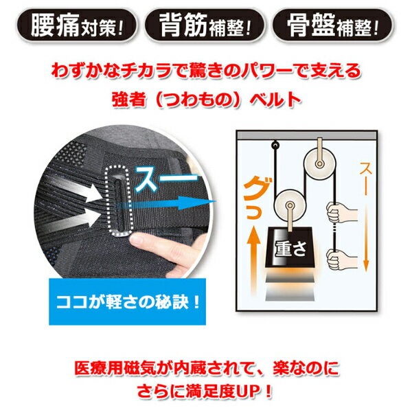 商品名 デラックス磁気パワーベルト 商品特徴 医療用磁気内臓、腰まわりの悩みも、磁気のパワーで腰がラクに! 滑車の原理で少しの力でもギューっとしまって腰をしっかり支えてくれるので、年配の方や、女性の方でも簡単に着けることができます。 ベルト中央部分には、100ミリテスラ磁石を4個配置。磁気の力で腰の痛みをサポート。背筋や骨盤の補正もしてくれます。 商品仕様 【カラー】黒 【サイズ・重量】 ●SMサイズ:ウエスト65~85cm、130g ●MLサイズ:ウエスト80~105cm、150g 【平置きサイズ】 ●SM:腰高さ8×ベルト長さ87cm ●ML:腰高さ8×ベルト長さ105cm 【材質】 ●ベルト:ナイロン、ポリエステル、ポリウレタン ●補助ベルト:ナイロン、ポリエステル、ポリウレタン ●リング:ポリアセタール 【管理医療機器認証番号】220AIBZX00090000 【区分】日本製・医療機器 【メーカー】株式会社アクセス 【広告文責】株式会社スパーク 0276-52-3731 【関連キーワード】医療機器 磁気ベルト 磁石 磁気 ベルト 腰痛 こり 血行 磁気付きベルト 磁気腰ベルト 腰痛ベルト コルセット 健康グッズ グッズ 送料無料 おすすめ 人気 通販 販売