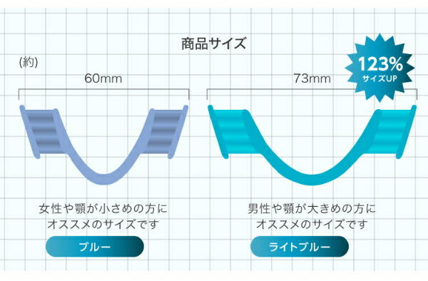商品名 歯ぎしりピタリ ストロング 商品特徴 歯医者さんと共同開発しました。 当商品は、寝る時に奥歯にはめることで歯ぎしりや食いしばりを防ぐことを目的としています。かみ合わせ矯正ではないので、型どりが必要ありません。奥歯にはめることで歯圧を吸収分散し、奥歯の負担を軽減します。 従来品よりも耐久性が約3倍アップ!(当社従来品比)。 男性でもお使いいただけるストロングタイプになりました。 商品仕様 【タイプ】 ●ブルー(女性やアゴが小さめの方) ●ライトブルー(男性やアゴが大きめの方) 【材質】本体:シリコーン ケース:pp 【現品サイズ】 ●ブルー:6.0×2.7×1.4cm ●ライトブルー:7.3×2.7×1.4cm 【パッケージサイズ】W8.0×D3.1×H14cm 【重量】2.4g 【生産国】日本 【ブランド】プロイデア 【メーカー】株式会社ドリーム 【関連キーワード】ドリーム 歯ぎしりピタリ ストロング セット 安眠グッズ 健康グッズ マウスピース 歯ぎしり 食いしばり 対策 防止 予防 歯ぎしり防止 歯ぎしり対策 食いしばり防止 食いしばり対策 睡眠 安眠 熟睡 快眠グッズ メンズ レディース 男性用 女性用 男女兼用 日本製 国産 便利 グッズ 送料無料 おすすめ 人気 通販 販売
