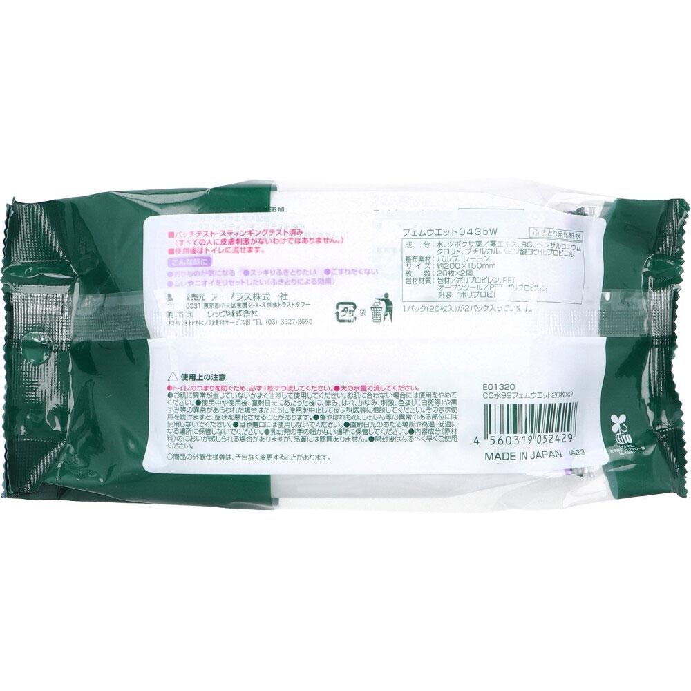 ツボクサエキス配合!●使用後はトイレに流せます。●パラベン・アルコール・香料無添加。●パッチテスト・スティンギングテスト済み。(すべての人に皮膚刺激がないわけではありません。)●こんな時に。・おりものが気になる。・スッキリふくとりたい。・こすりたくない。・ムレやニオイをリセットしたい。(ふきとりによる効果)北海道・沖縄・離島へのお届けは別途送料を請求させていただきます。*製品の仕様・画像・パッケージは、変更される場合があります。 *当店では在庫をメーカーと共有しており、商品によっては欠品の場合がございます。 万一、ご注文頂きました商品が欠品の場合はご連絡させていただきます。 *ご注文確定後のキャンセル不可 商品管理番号 4560319052429 生産地 日本 サイズ 個装サイズ:95X215X40mm個装重量:約210g内容量:20枚×2個入製造国:日本 素材 【ふきとり用化粧水】販売名:フェムウエット043bW【成分】水、ツボクサ葉/茎エキス、BG 、ベンザルコニウムクロリド、ブチルカルバミン酸ヨウ化プロピニル【基布素材】パルプ、レーヨン【サイズ】約200×150mm 注意事項 【使用上の注意】・トイレのつまりを防ぐため、必ず1枚ずつ流してください。・大の水流で流してください。・お肌に異常が生じていないかよく注意して使用してください。お肌に合わない場合には使用をやめてください。・使用中や使用後、直射日光にあたった後に、赤み、はれ、かゆみ、色抜け(白斑等)や黒ずみ等の異常があらわれた場合はただちに使用を中止して皮フ科医等に相談してください。そのまま使用を続けますと、症状を悪化させることがあります。・傷やはれもの、しっしん等の異常のある部位には使用しいでください。・目や傷口には使用しないでください。・直射日光のあたる場所や高温・低温になる場所に保管しないでください。・乳幼児の手の届かない場所に保管してください。・内容成分(原材料)のにおいが感じられる場合がありますが、品質には問題ありません。・開封後はなるべく早くご使用ください。 メーカー レック株式会社